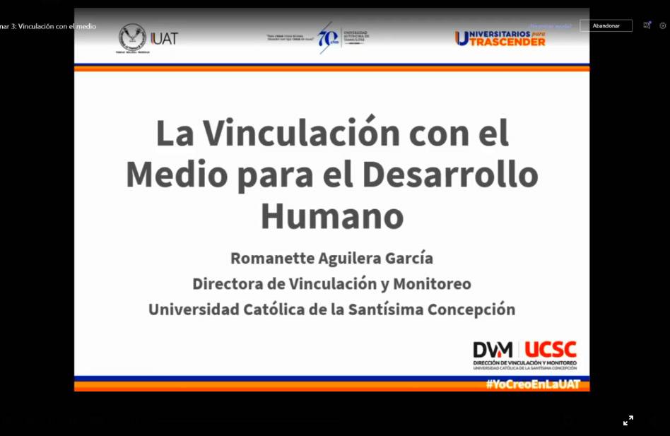 En el marco del seminario internacional "Desafíos del desarrollo local y capital territorial en tiempos de Covid 19", la Universidad Autónoma de Tamaulipas (UAT) realizó la conferencia “Vinculación con el medio”, como parte del proyecto “Universitarios para Trascender”, impulsado por la máxima casa de estudios del estado.