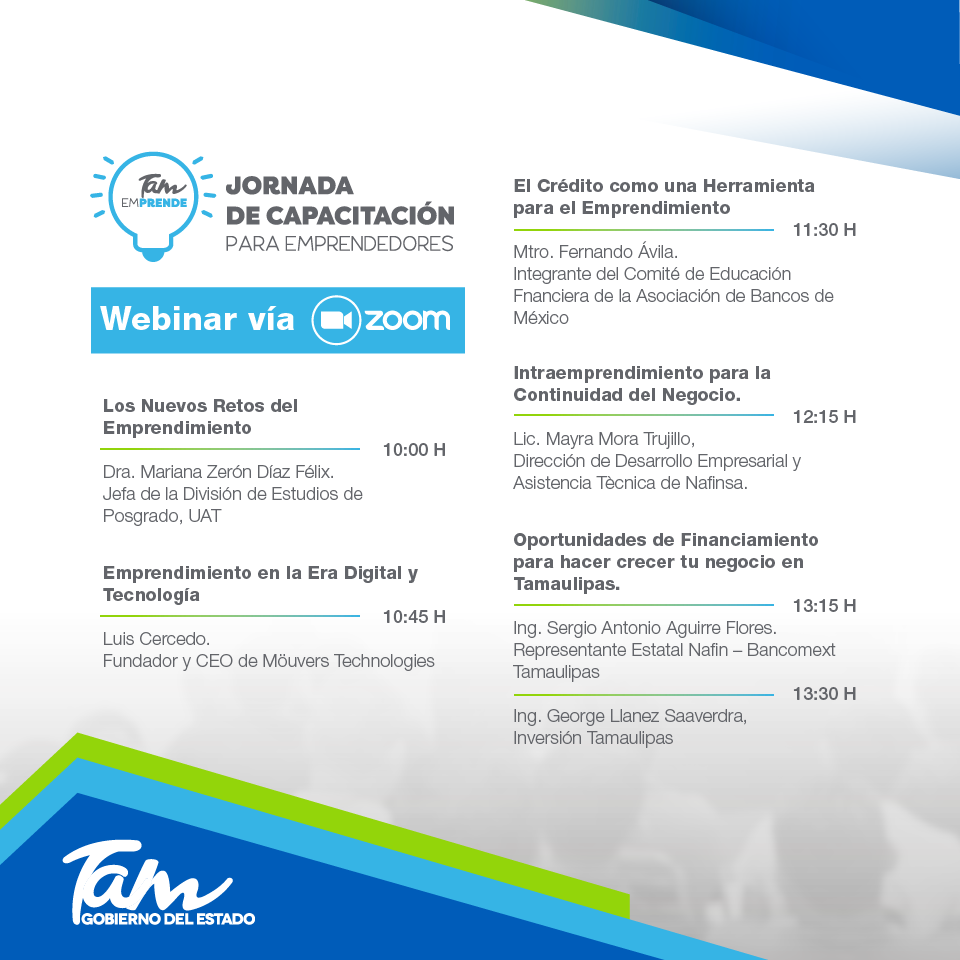 El webinar está conformado por los temas: “Los nuevos retos del emprendimiento”, “Emprendimiento en la era digital y tecnológico”, “El crédito como una herramienta para el emprendimiento”, “Intraemprendimiento para la continuidad del negocio” y “Oportunidades de financiamiento para hacer crecer tu negocio en Tamaulipas”.