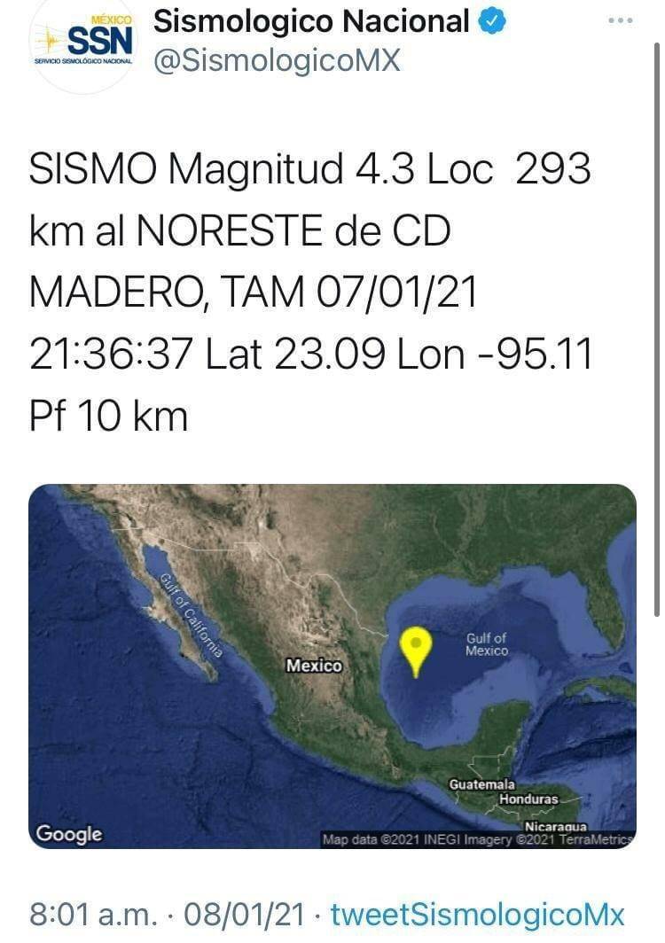 Con una magnitud, la noche del día de ayer se registró un sismo en el Municipio de Madero.
