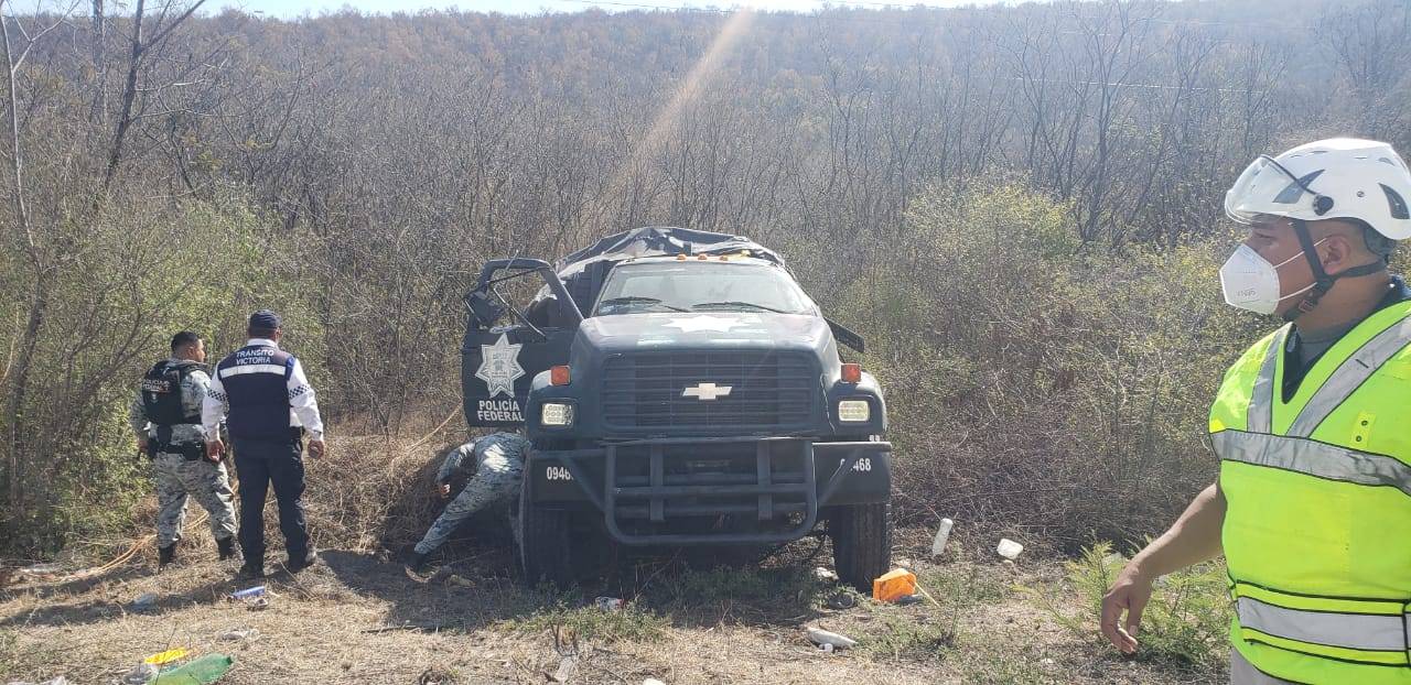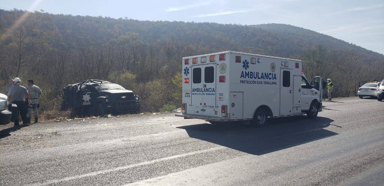 Dos elementos de la Guardia Nacional resultaron lesionados, esta mañana, al volcar la unidad en la cual se trasladaban de Ciudad Victoria a San Luis Potosi.