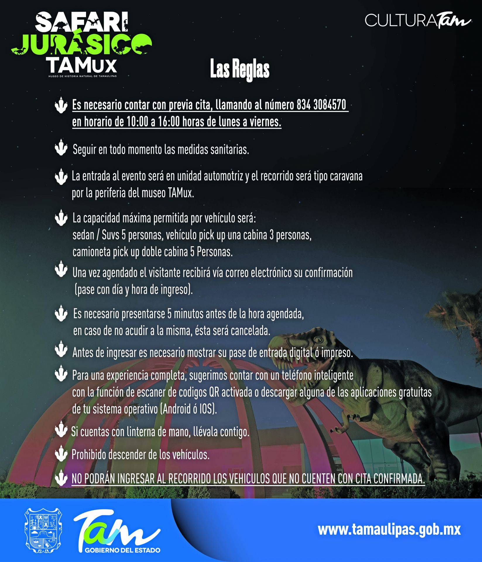 Los recorridos del “Safari Jurásico TAMux” se llevarán a cabo los viernes, sábados y domingos del mes de marzo en un horario de 19:00 a 22:00 horas. Para acudir será estrictamente necesario que cuentes con una cita confirmada a través de los teléfonos 8343084570 y 8343524056 así como contar con los siguientes requisitos al momento de programar tu visita:
