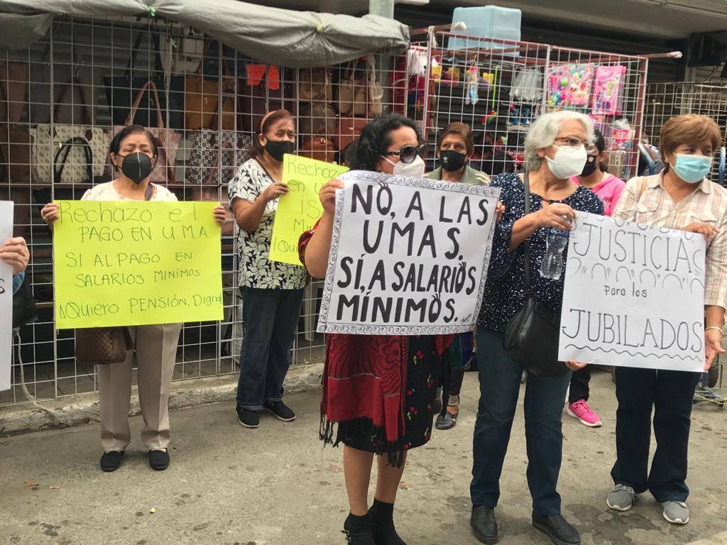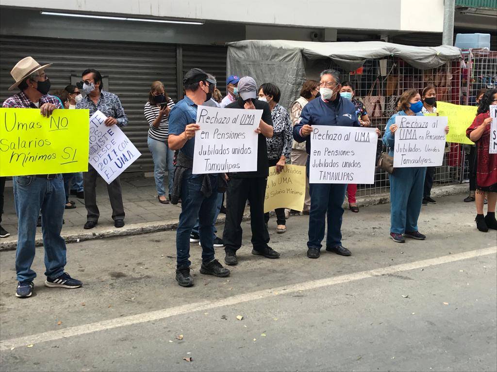 Los manifestantes portaban pancartas que reclamaban “No al pago en UMAS, sí al Salario Mínimo”, una pensión digna".
