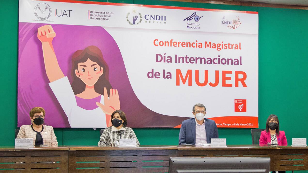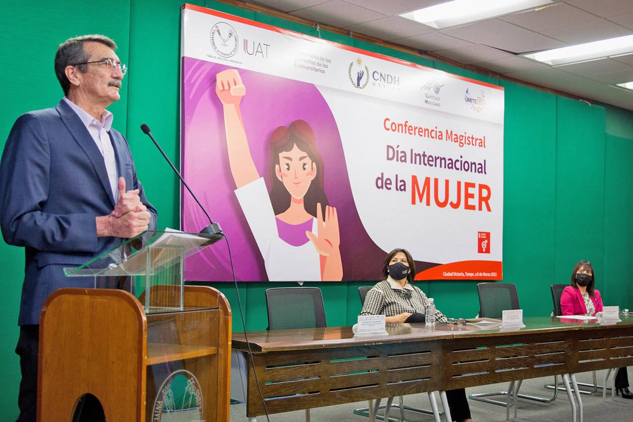 Durante su mensaje inaugural de la conferencia organizada por la Defensoría de los Derechos de los Universitarios de la UAT, el Rector reiteró el respeto, respaldo y admiración a las mujeres.
