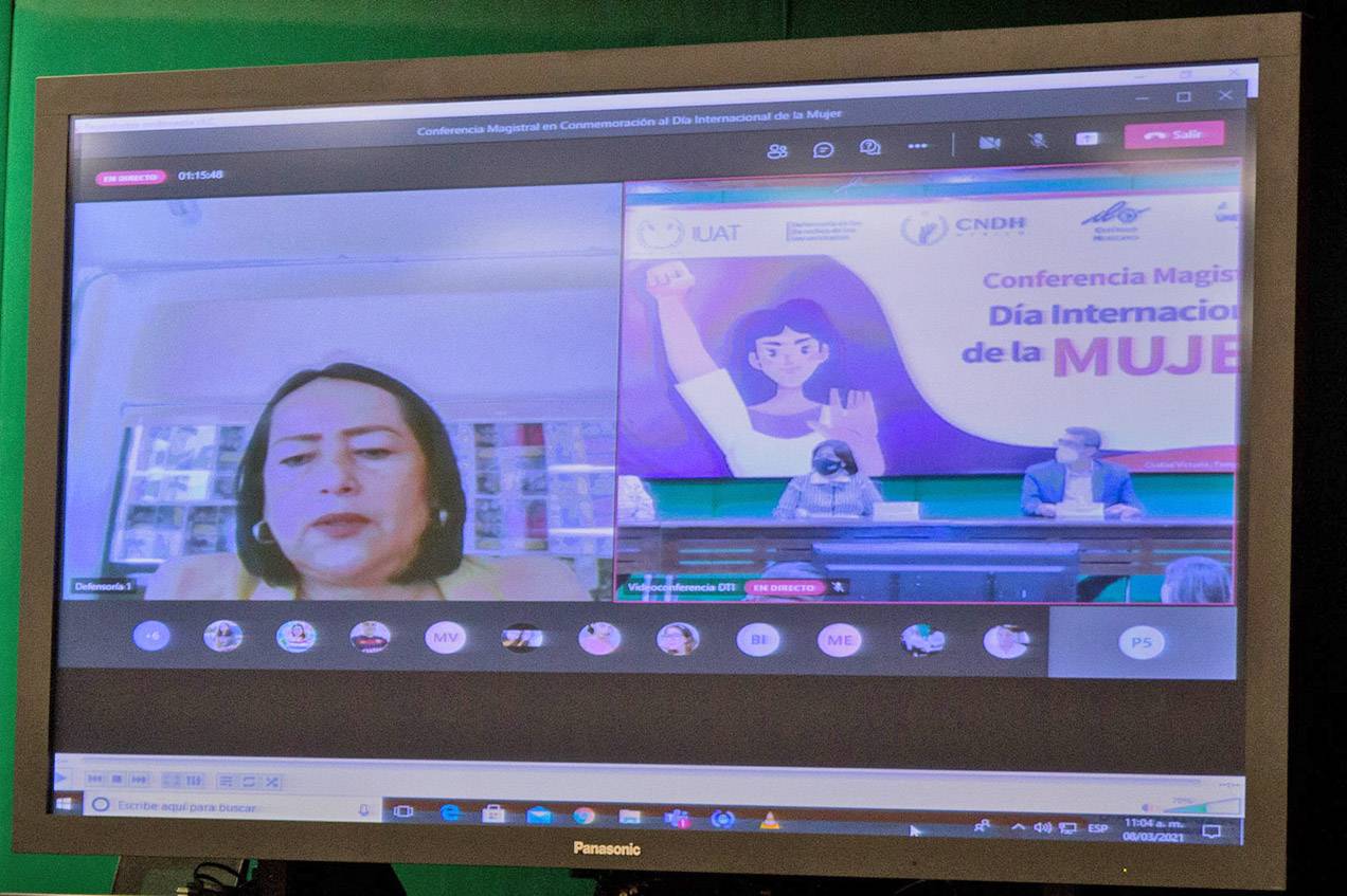 Posteriormente, dio paso a la conferencia transmitida por la plataforma Teams, en donde la ponente, Adela Muñiz Guadarrama, destacó los avances del protocolo y las acciones en el cumplimiento de la recomendación general 43/2020 sobre “Violación al Acceso de Justicia e insuficiencia a la aplicación de políticas públicas en la prevención, atención sanción y reparación integral del daño a personas víctimas directas e indirectas de feminicidios y otras violencias”.