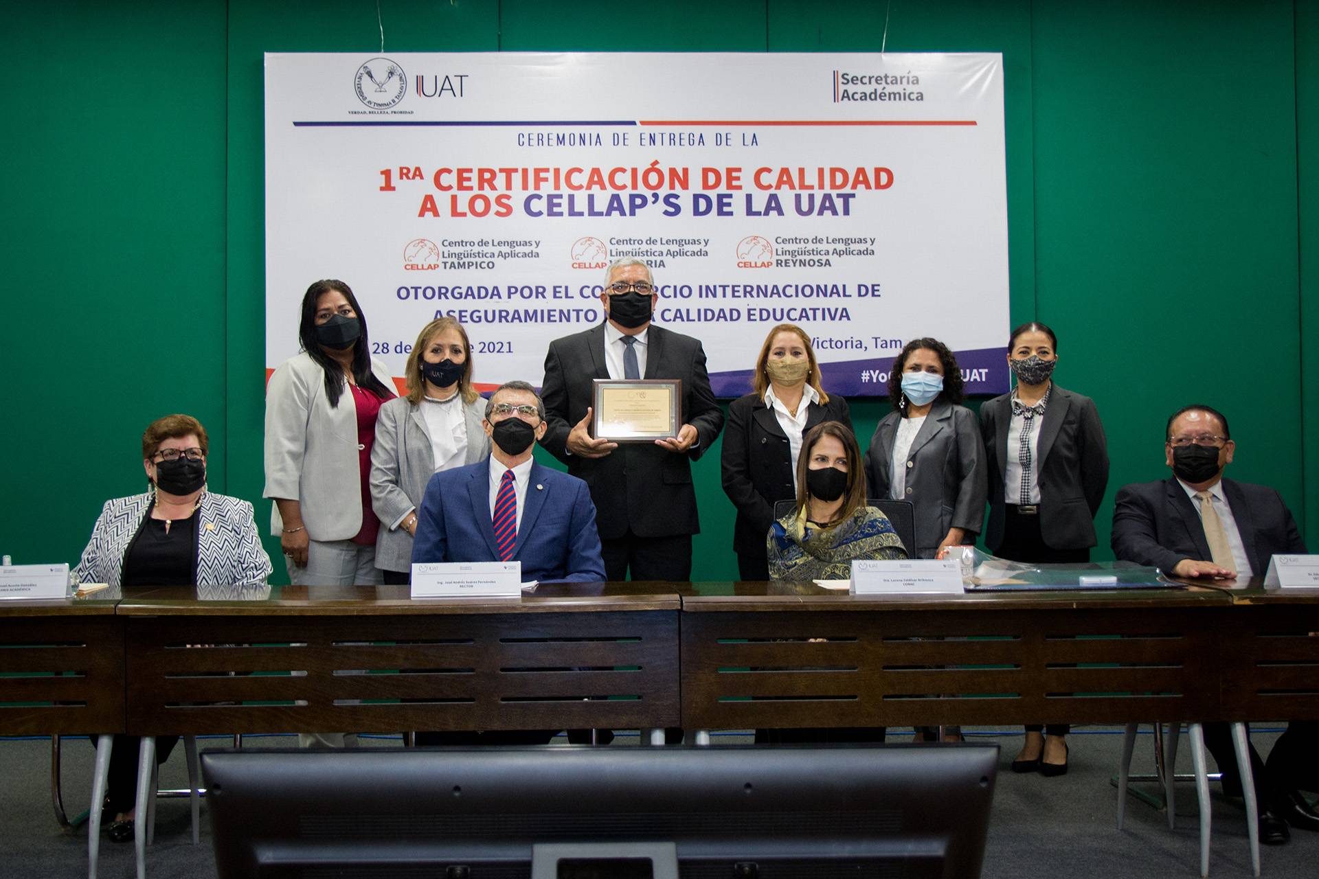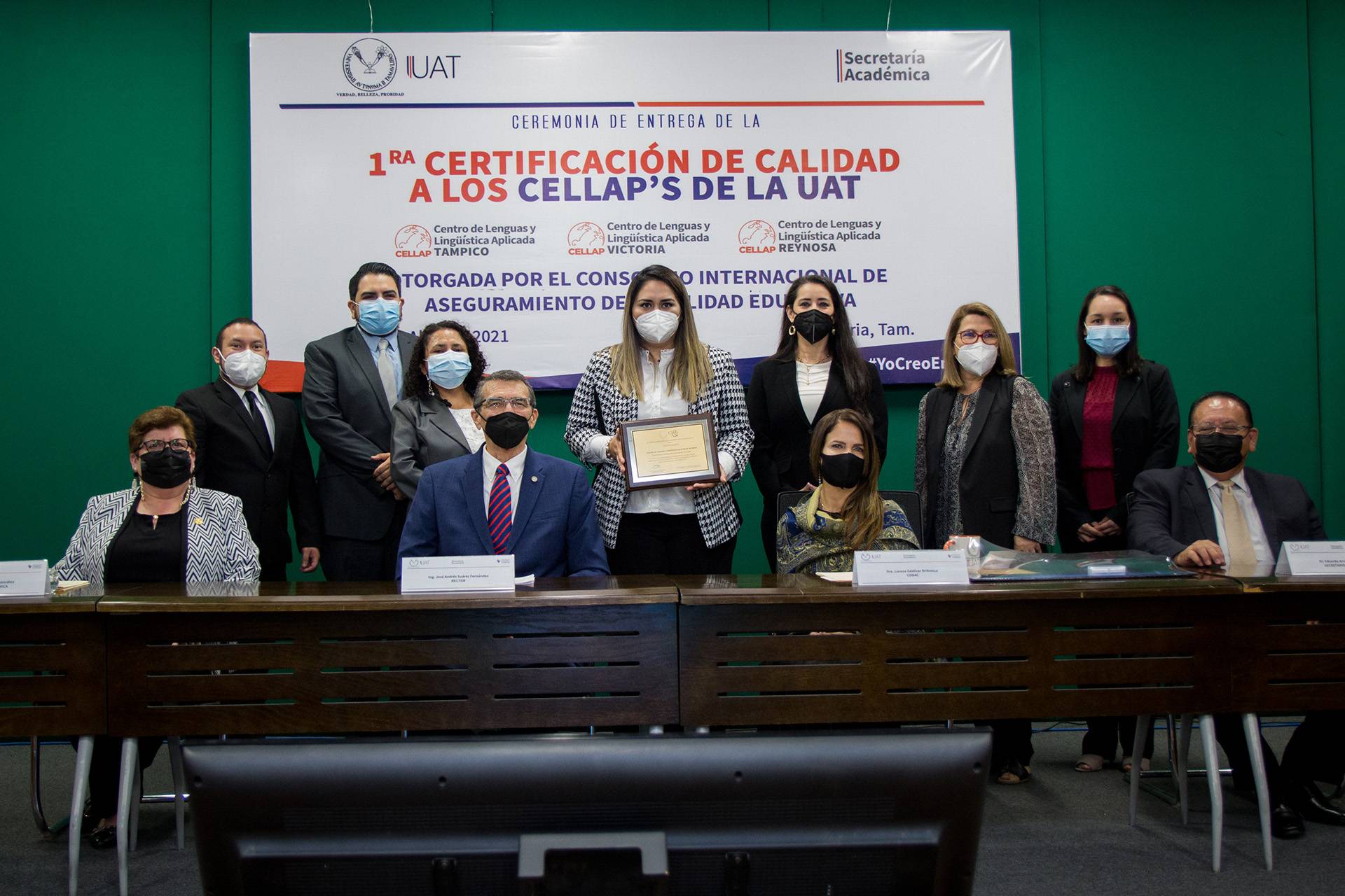 El Rector de la Universidad Autónoma de Tamaulipas (UAT), Ing. José Andrés Suárez Fernández, presidió la ceremonia de entrega de certificaciones a los Centros de Lenguas y Lingüística Aplicada (CELLAP) de las sedes de Reynosa, Victoria y Tampico, que fueron otorgadas por el Consorcio Internacional de Aseguramiento de la Calidad Educativa (ICEQ, por sus siglas en inglés).