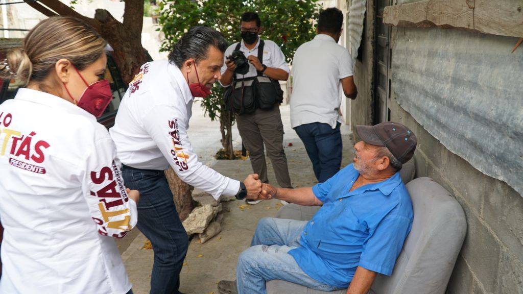 De la mano de su esposa Lucy Rodríguez de Gattás, el candidato de la coalición Morena-PT a la alcaldía de Victoria, arribó a la casa de Osiel Ríos, presidente del Comité del partido Morena, donde ya los esperaba un grupo de mujeres, jefes de familia, jóvenes y niños quienes les dieron un cálido recibimiento.
