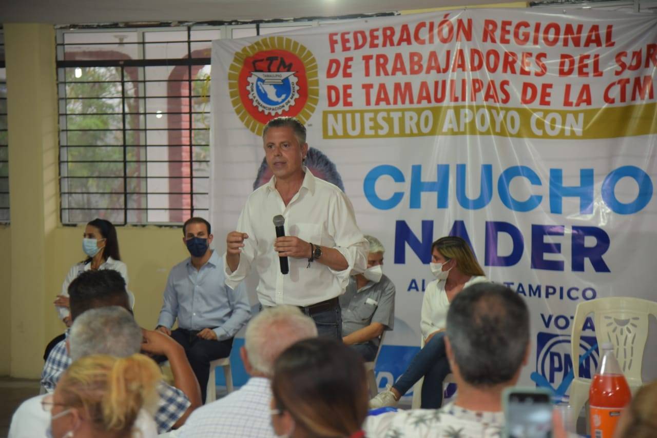 Trabajadores adheridos a más de 30 organizaciones sindicales de Tampico, manifestaron su absoluto respaldo a Chucho Nader candidato del PAN a la Presidencia municipal, durante un encuentro celebrado este miércoles en las instalaciones de la Confederación Regional de Trabajadores del Sur de Tamaulipas, a la que también asistió el dirigente de esta federación, Edmundo García Román y los comités directivos de cada uno de los sindicatos.