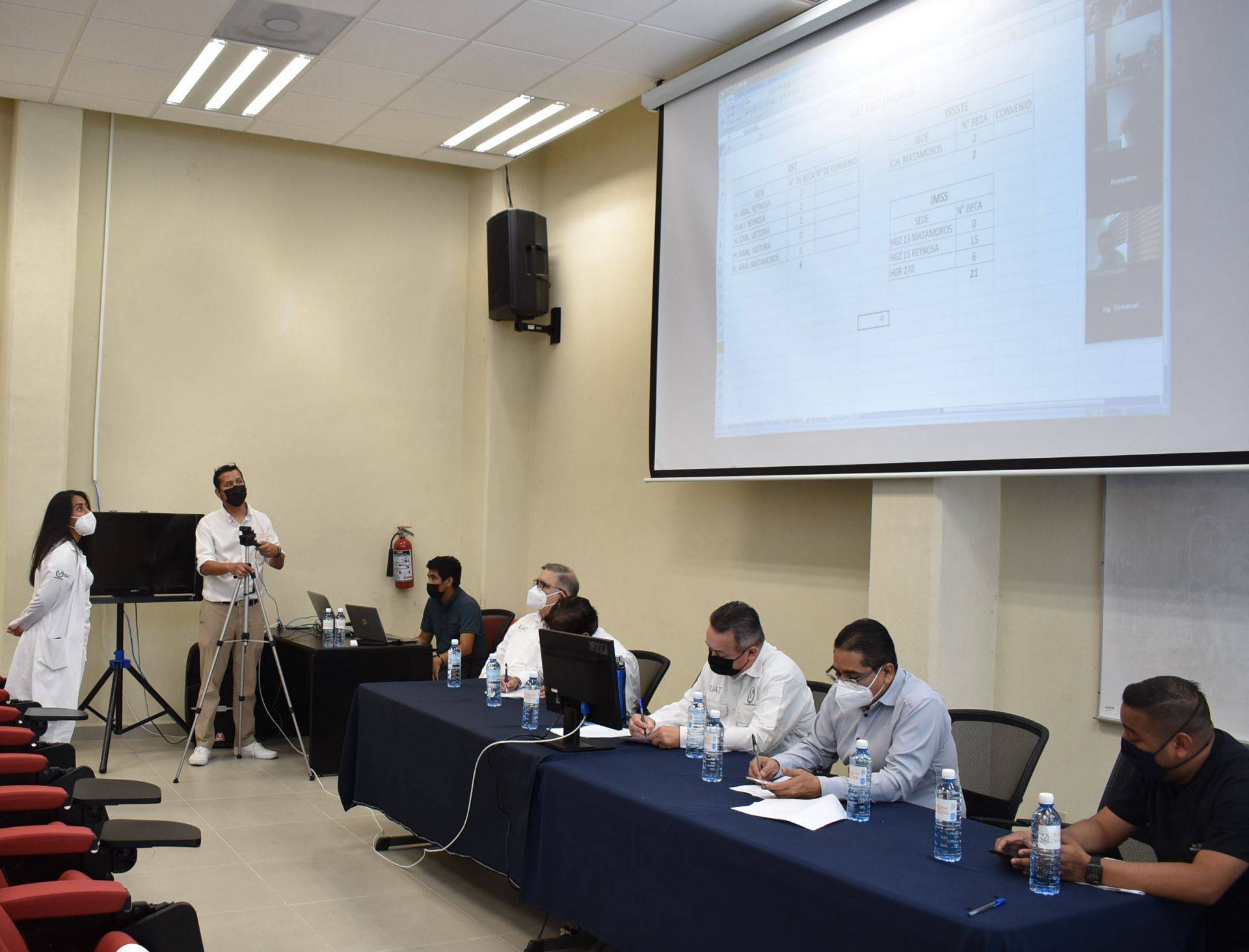 En la ceremonia estuvieron presentes mediante videoconferencia las autoridades del Sector Salud: el encargado de la Dirección de Calidad y Educación en Salud, Dr. Ariel Oliden Mercado Cárdenas; el jefe del Departamento de Enseñanza, Pregrado, Posgrado e Investigación, Dr. Francisco Javier García Luna Martínez; el Coordinador Estatal de Servicio Social de Medicina e Internado de Pregrado, Lic. José Miguel García Ferretis; el Coordinador de Enseñanza del IMSS en el estado, Dr. Felipe Guarneros; y la Coordinadora del Área de Enseñanza de la delegación del ISSSTE, Lic. Alejandra Treviño.