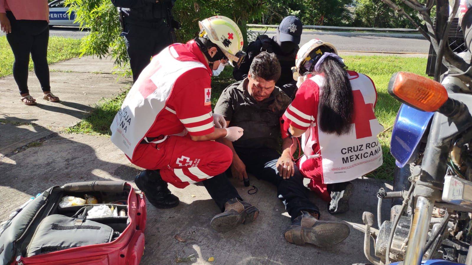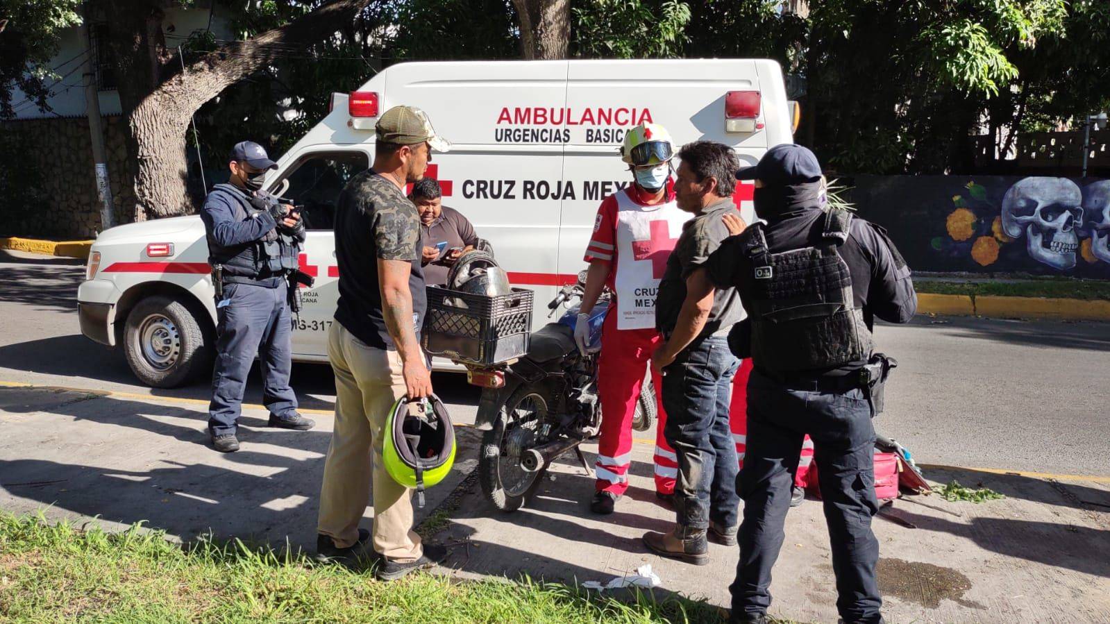 Tras chocar contra el cordón de la banqueta el motociclista salió proyectado y cayó al suelo resultando con golpes en varias partes del cuerpo.