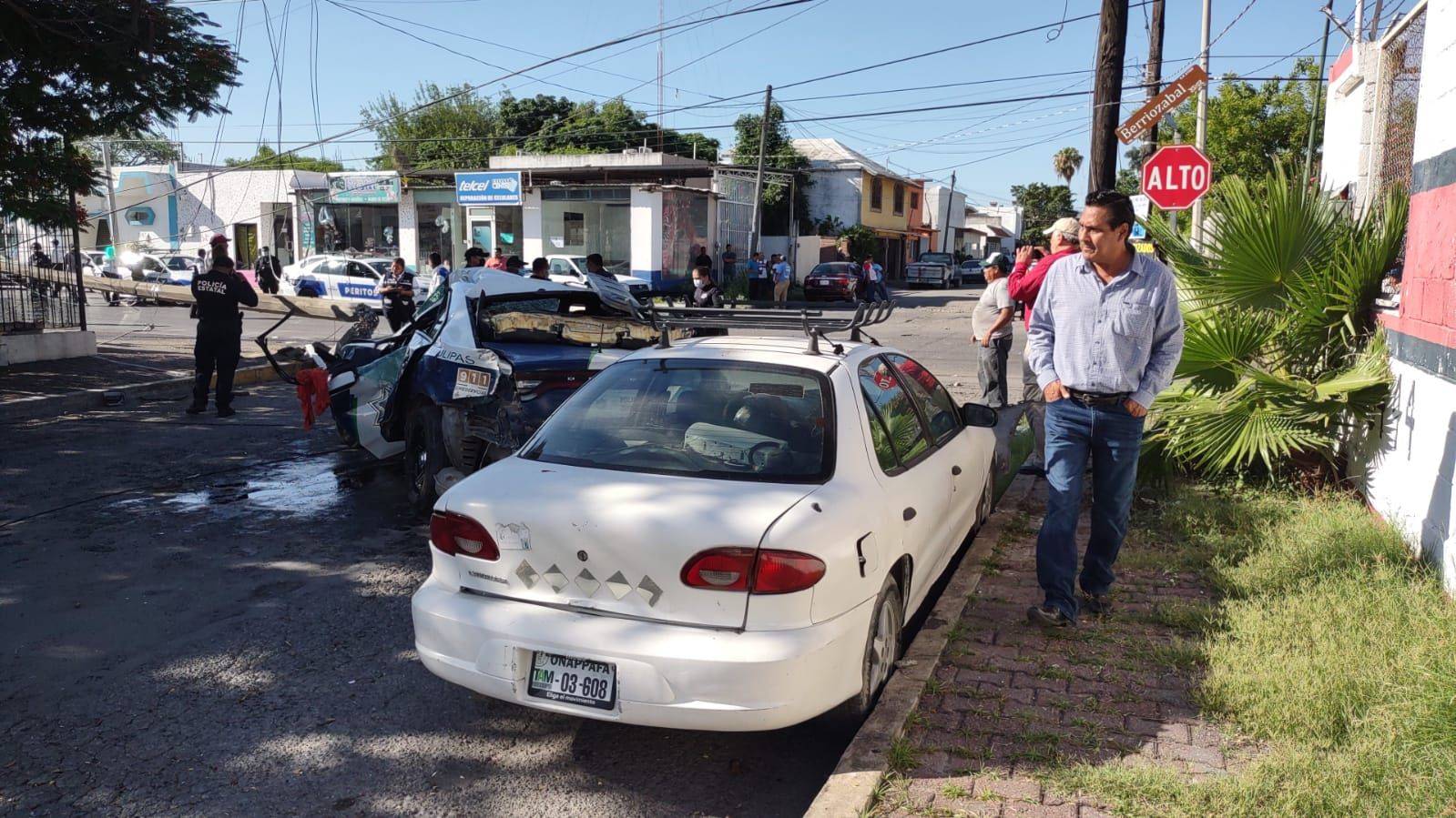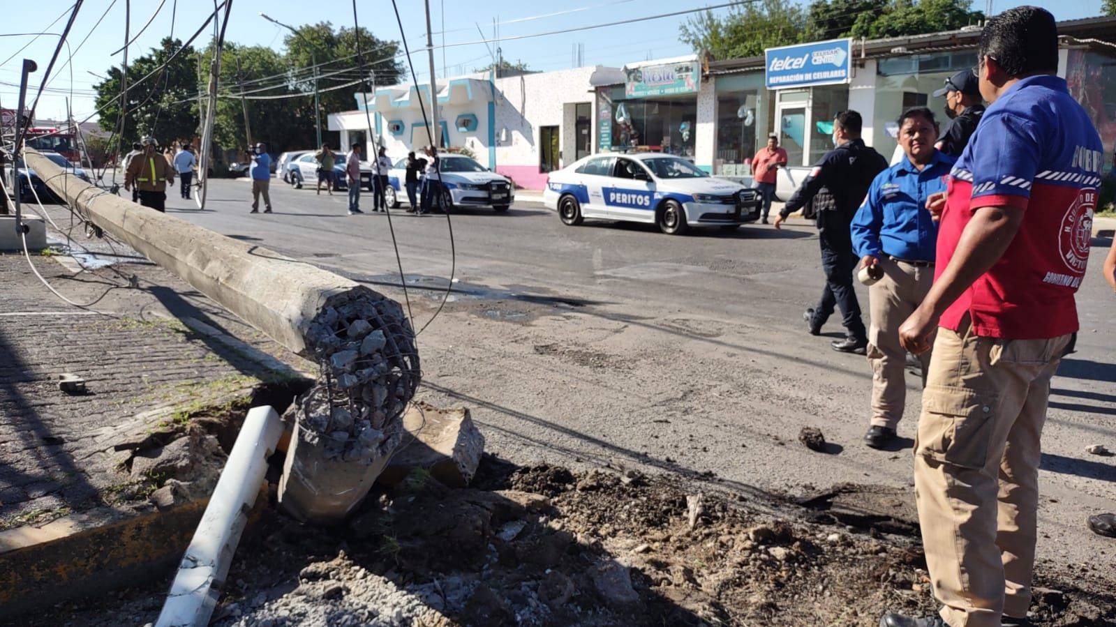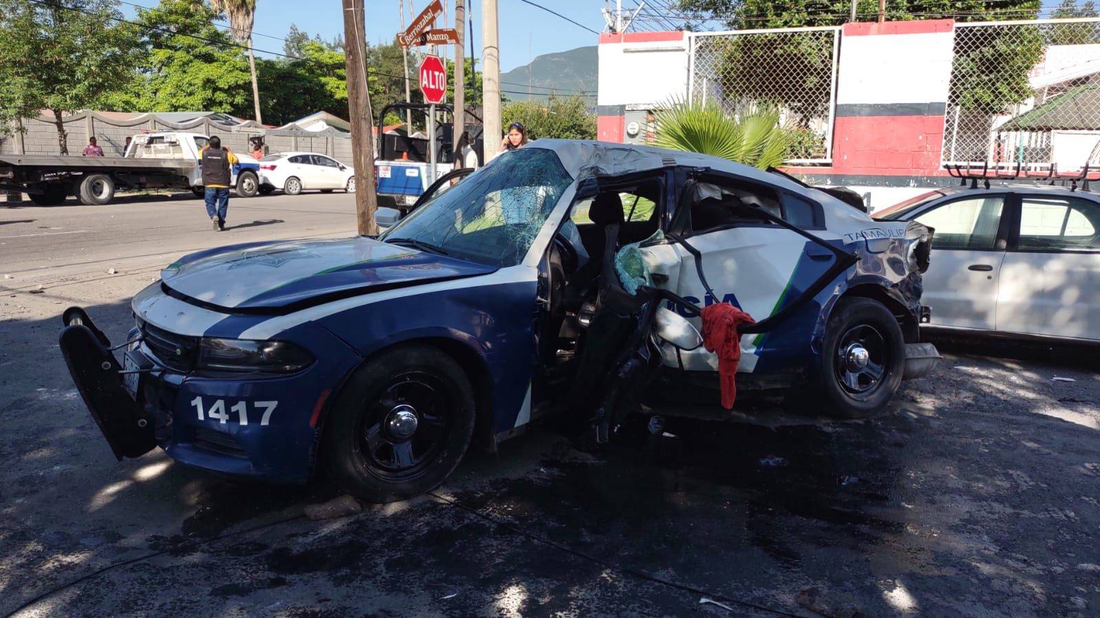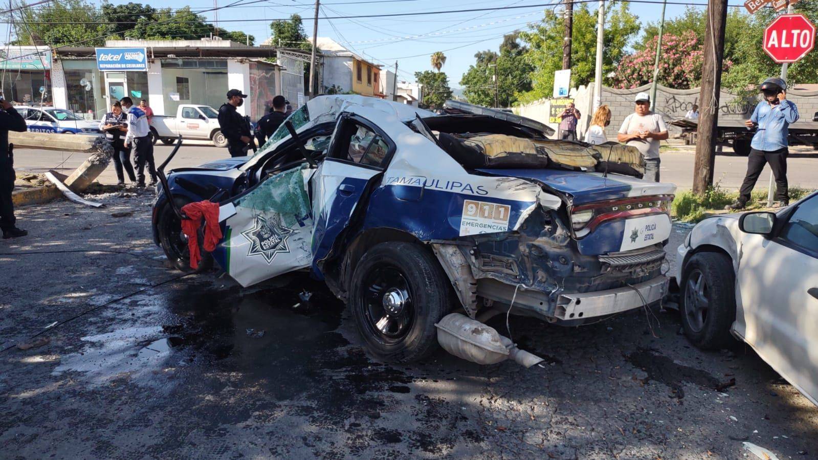 Después de impactarse contra la Tornado, la patrulla marca Dodge tipo Charger salió proyectada y terminó por estrellarse contra un poste de concreto propiedad de la Comisión Federal de Electricidad.
