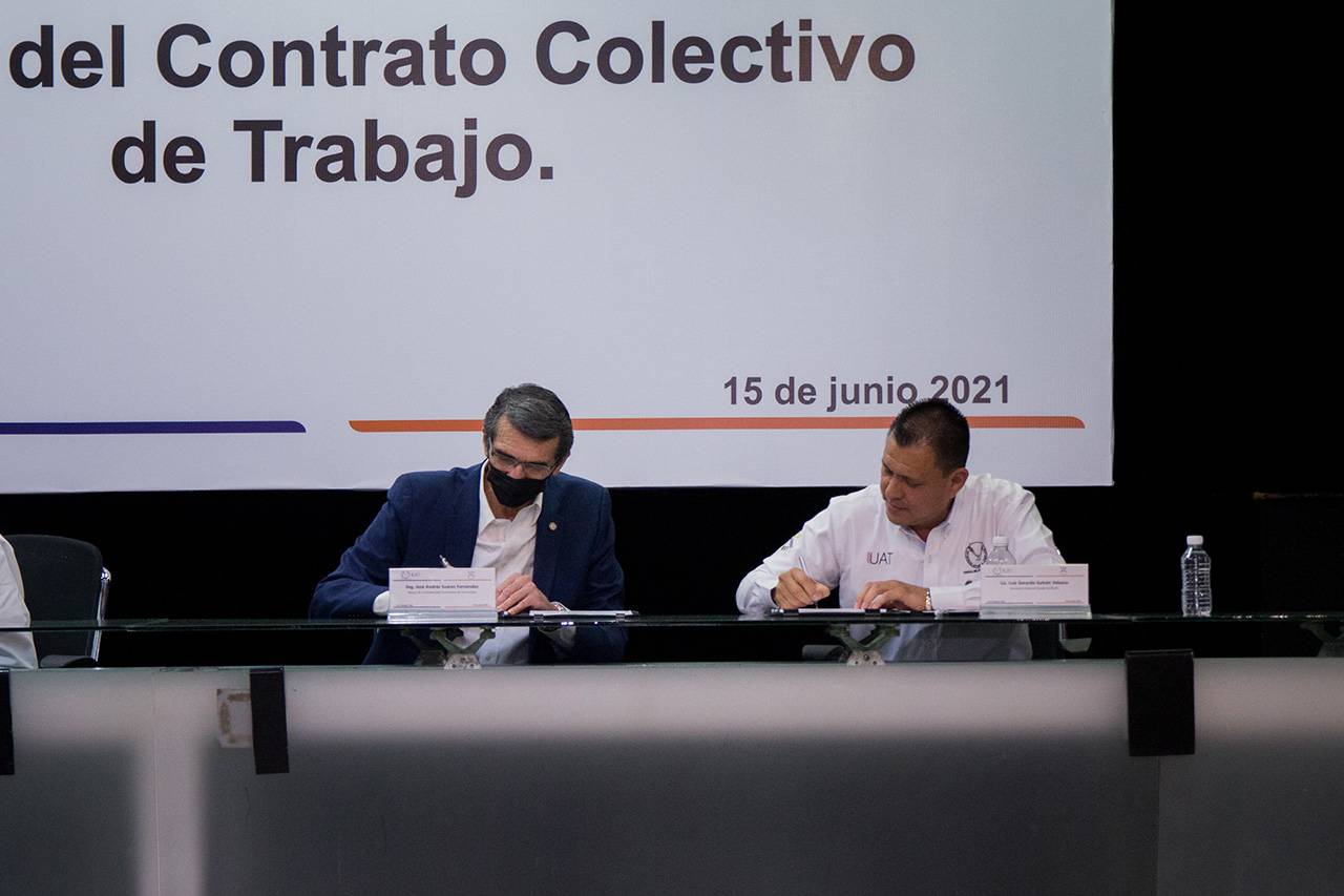 En el evento realizado en el Teatro Universitario ubicado en el edificio de la Rectoría, el Ing. Suárez Fernández firmó el documento con el Secretario General del SUTAUAT, Mtro. Luis Gerardo Galván Velasco, ante la presencia de los delegados sindicales de las diferentes dependencias académicas.