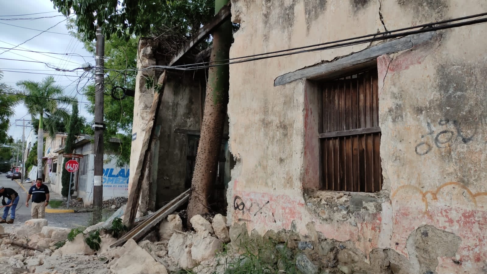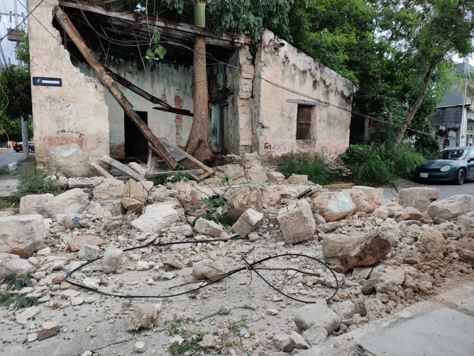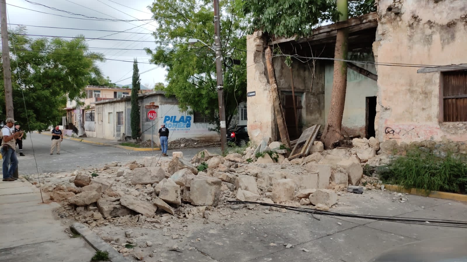 Dejando completamente obstruida la vialidad en el crucero del 16 Méndez, las enormes piezas de sillar cayeron sobre la superficie de rodamiento vehicular después de desprenderse del antiguo inmueble.