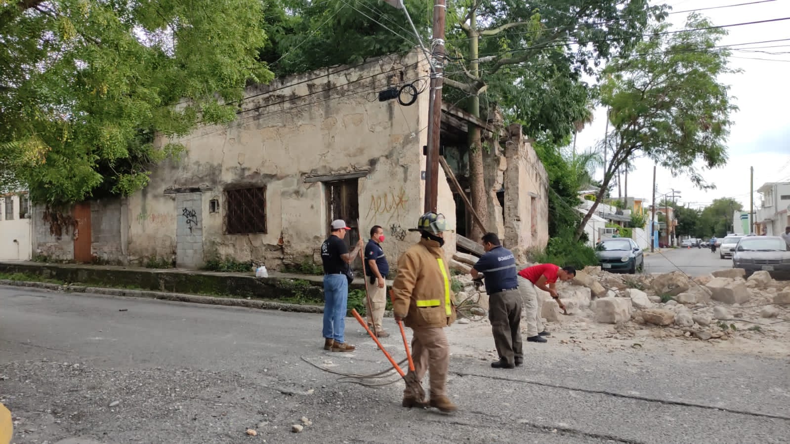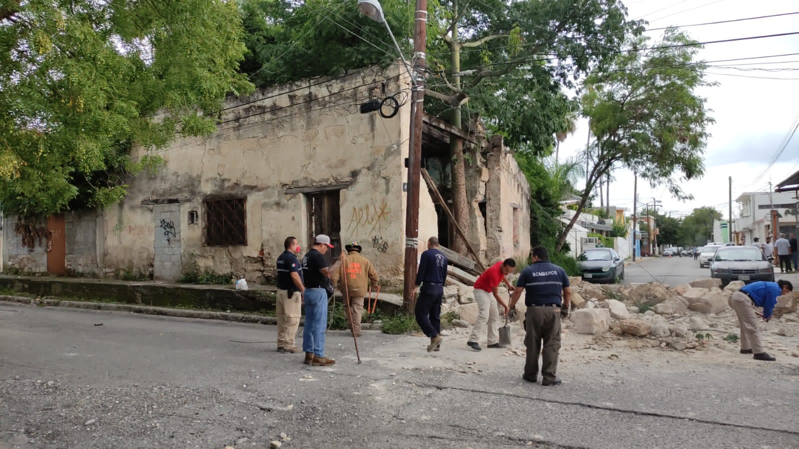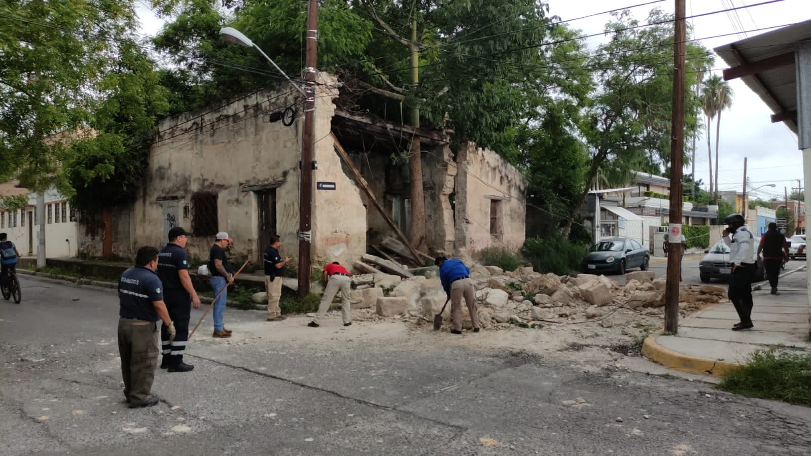 Dejando completamente obstruida la vialidad en el crucero del 16 Méndez, las enormes piezas de sillar cayeron sobre la superficie de rodamiento vehicular después de desprenderse del antiguo inmueble.