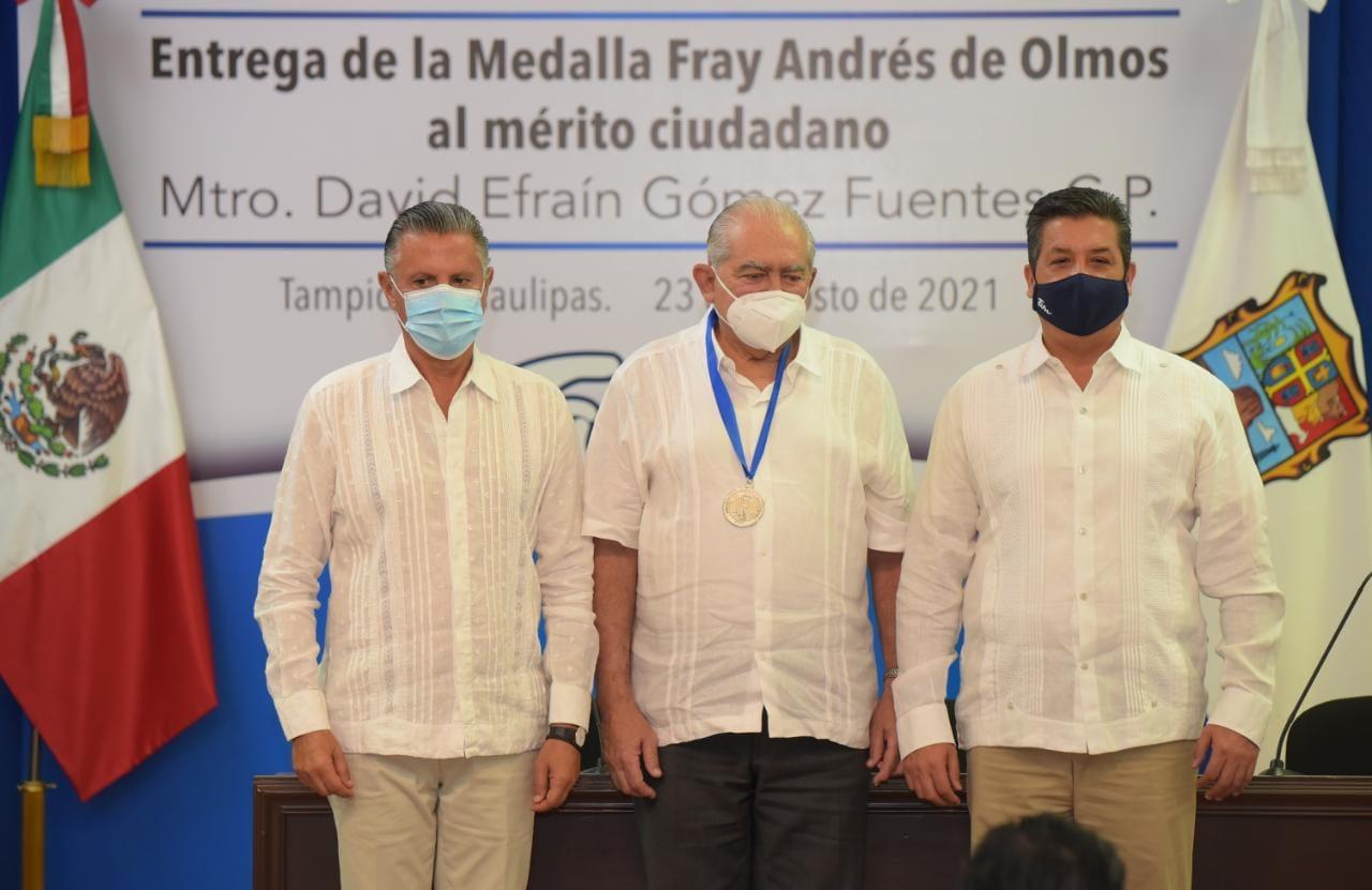 Con la presencia del Gobernador del Estado, Francisco García Cabeza de Vaca, el Alcalde Chucho nader en sesión solemne de cabildo entregaron este lunes, la Medalla al Mérito Ciudadano "Fray Andrés de Olmos" al Maestro David Efraín Gómez Fuentes, fundador del Instituto de Estudios Superiores del Sur de Tamaulipas y notable tampiqueño en el ámbito de la docencia, y la investigación, así como en el servicio público y sector empresarial.