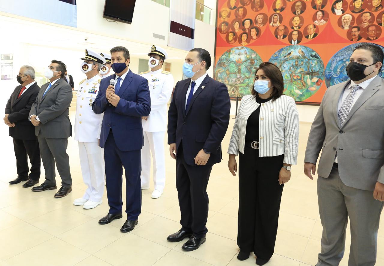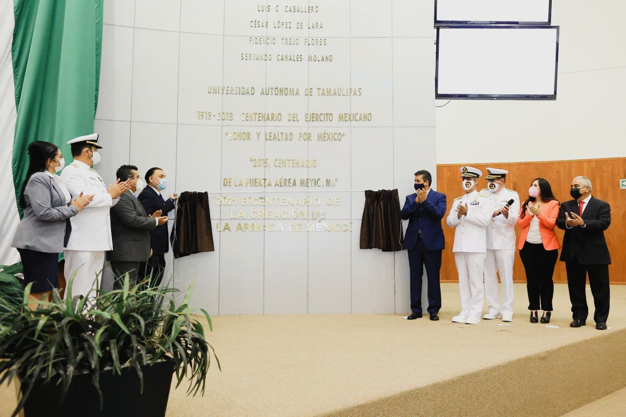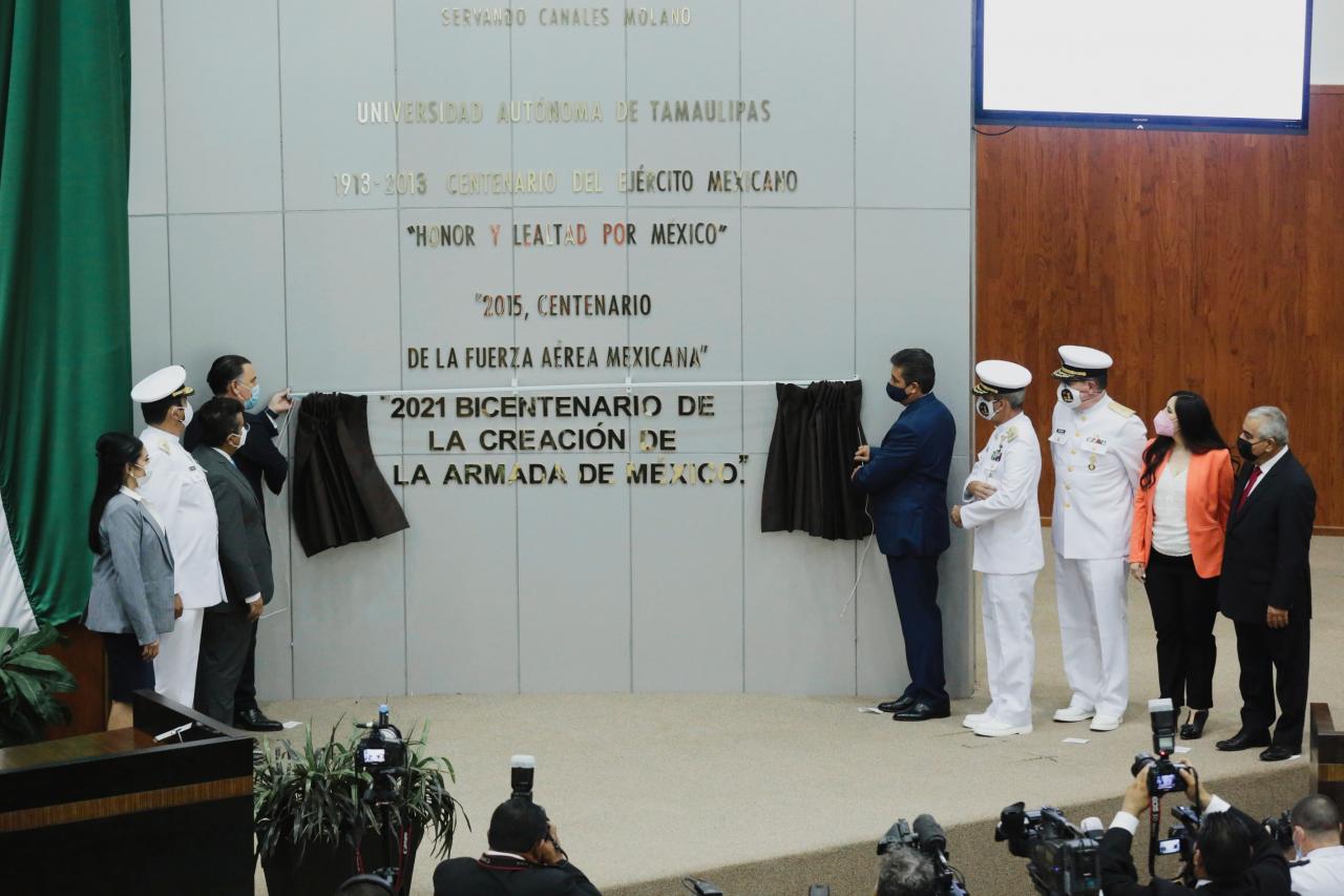 Durante la ceremonia, el Gobernador Francisco García Cabeza de Vaca junto a otras autoridades realizaron la develación, misma en la que se lee: “2021 Bicentenario de la creación de la Armada de México”, como reconocimiento a dicha institución por los 200 años de servicio a nuestra patria.