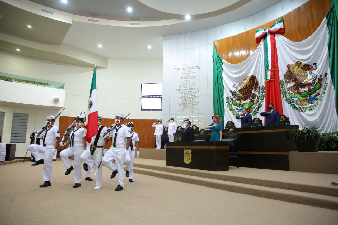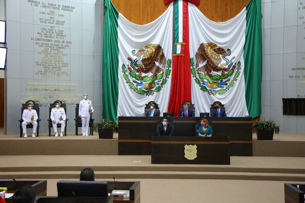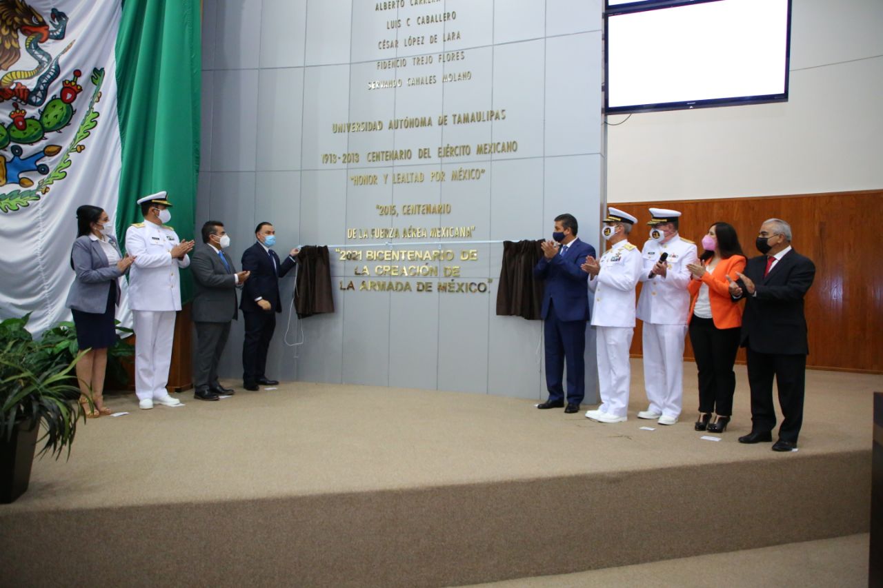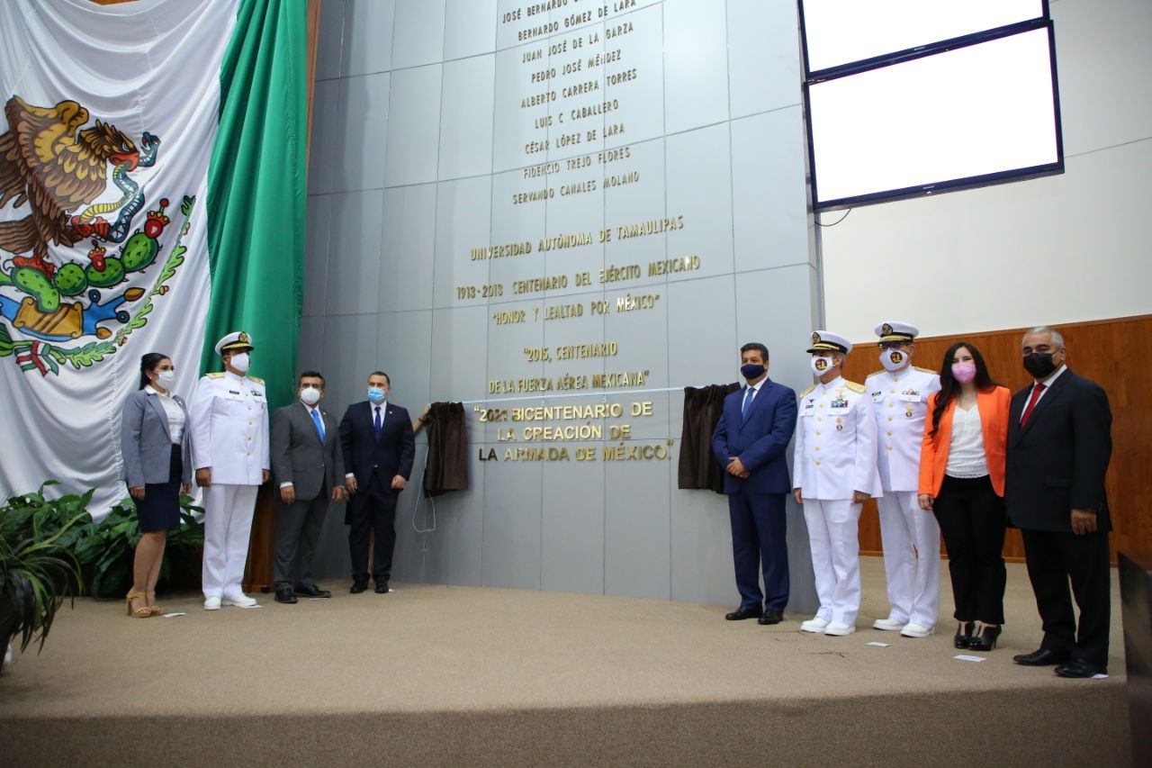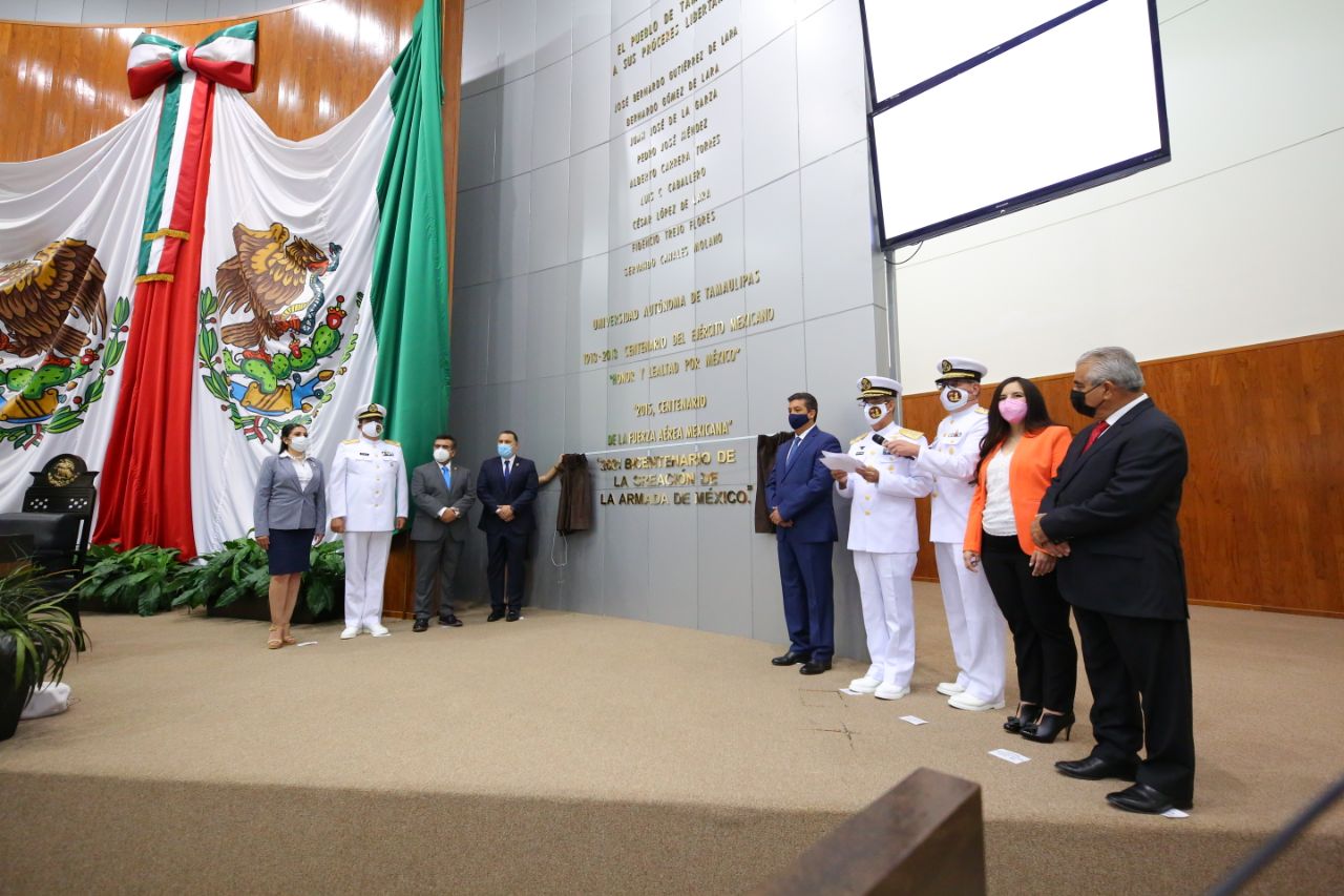 Con la presencia del Gobernador Francisco García Cabeza de Vaca, la Sexagésima Cuarta Legislatura de Tamaulipas develó en el Muro de Honor del Congreso del Estado, la inscripción en letras doradas de la leyenda “2021 Bicentenario de la Creación de la Armada de México”, contando con la presencia del personal de esta importante institución.