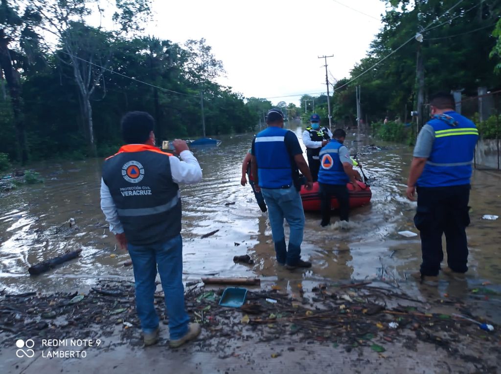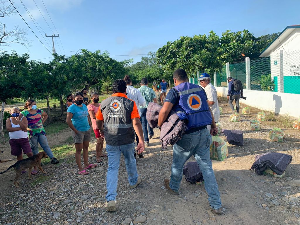 Durante el segundo día de estancia, las tareas de coordinación y colaboración con Protección Civil de Veracruz y ayuntamientos de ese estado estuvieron también dedicadas a prestar atención multidisciplinaria a las colonias Santa Fe y Campo de Aviación con entregas de insumos en zonas afectadas con entregas de colchones y evaluación y alerta sobre el crecimiento de cauces de ríos y arroyos del sector.