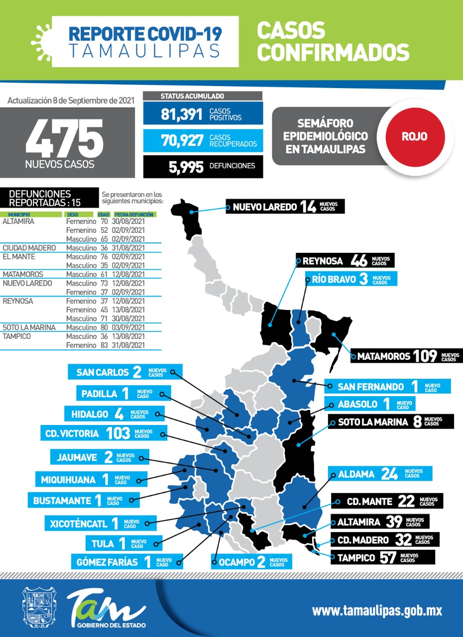 Pruebas de laboratorio practicadas durante las últimas 24 horas confirmaron 475 nuevos casos de COVID-19 y 15 fallecimientos en Tamaulipas, informó la secretaria de Salud, Gloria Molina Gamboa al presentar su reporte sobre el avance de la pandemia.