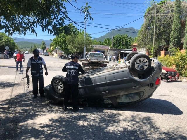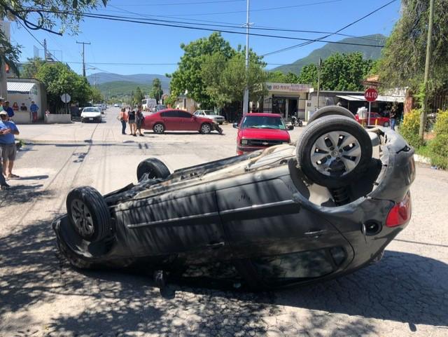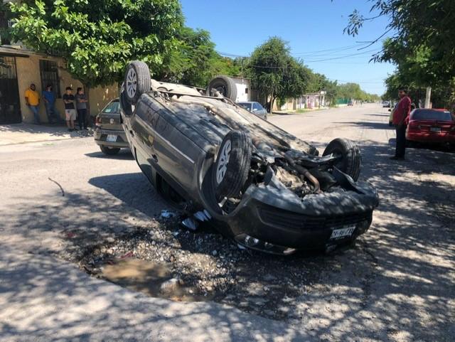 Una mujer resultó ilesa después de ocasionar un choque y volcar en la Colonia Américo Villarreal Guerra