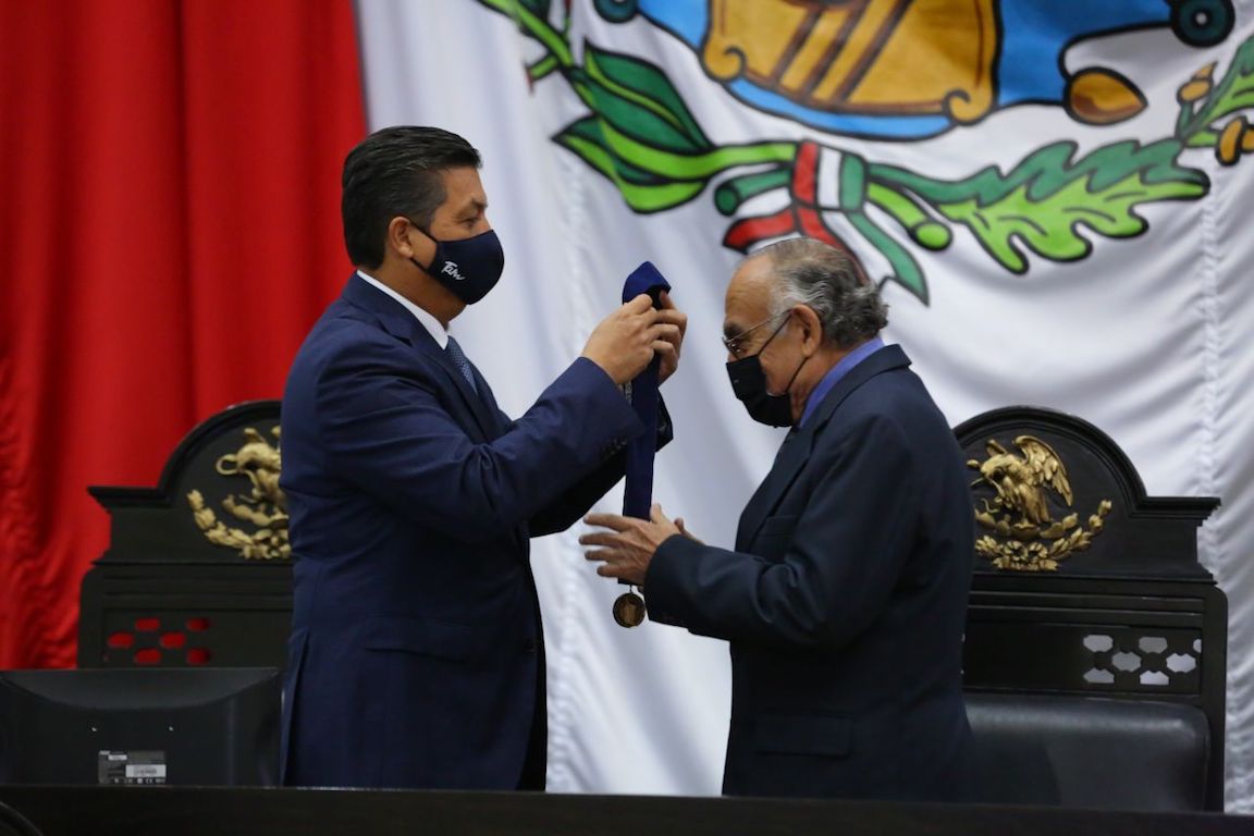 Es importante mencionar que luego de haberse aplazado la entrega de este galardón, por motivo de la contingencia sanitaria derivada del COVID-19, se llevó a cabo la imposición de la presea correspondiente al 2020 con las medidas sanitarias requeridas y con una moderada presencia de personas en galerías, así como con el personal de los servicios de técnicos necesarios.