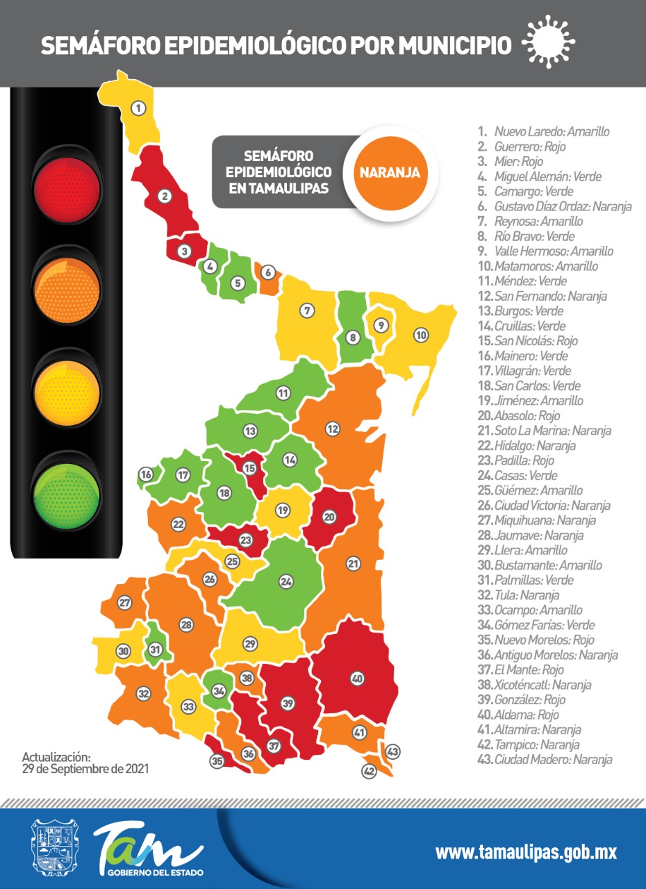 Tamaulipas continúa en semáforo epidemiológico naranja, que indica un nivel de riesgo alto con actividades que se abren de forma gradual pero continuando con las medidas obligatorias de uso del cubrebocas, el lavado frecuente de manos, la sana distancia y otras, que establece el decreto oficial.
