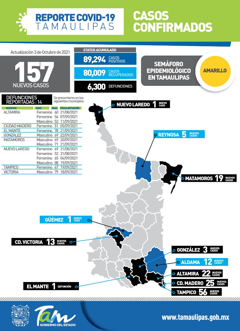 Durante las últimas 24 horas la pandemia de COVID-19 registró 157 nuevos casos y 14 fallecimientos en Tamaulipas, informó la secretaria de Salud, Gloria Molina Gamboa luego de señalar que los casos han disminuido en comparación con semanas anteriores, sin embargo es fundamental no bajar la guardia ni relajar las medidas preventivas para evitar rebrotes de la enfermedad.
