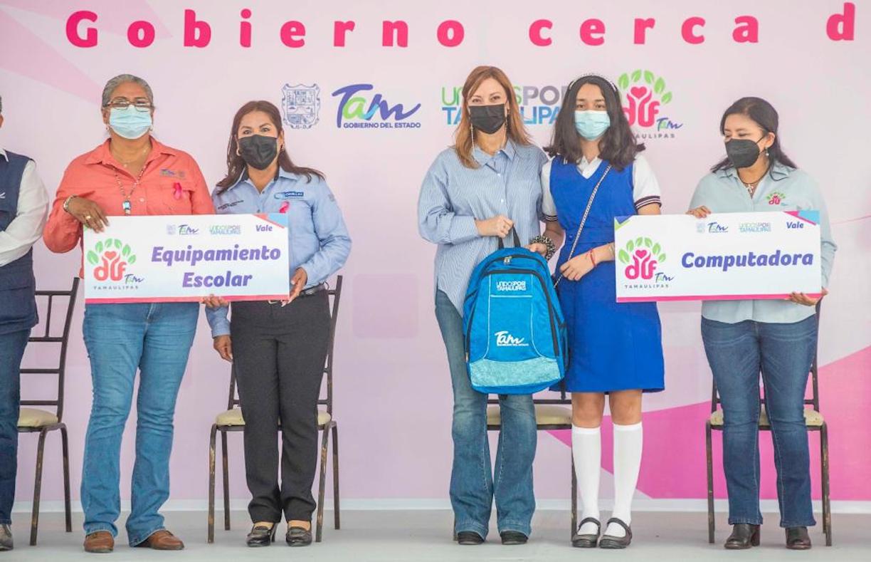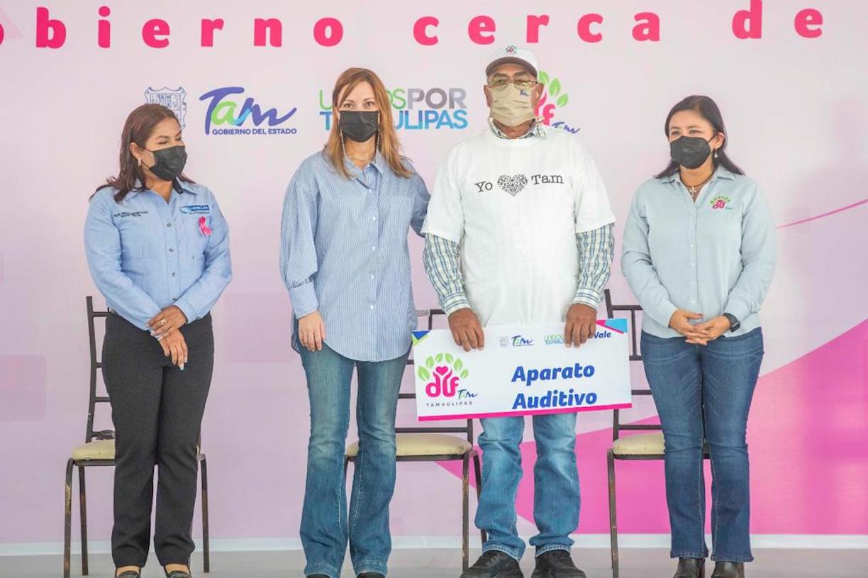Cruillas, Tamaulipas.- Con la entrega de apoyos, como actas de nacimiento, aparatos auditivos, paquetes de herramientas para el autoempleo, equipo de cómputo para 3 planteles educativos, mochilas con útiles escolares, uniformes, equipamiento escolar, se llevó a cabo la jornada asistencial Un Gobierno Cerca de Ti, en la cabecera municipal de Cruillas, estrategia coordinada por el Sistema DIF Tamaulipas, que preside Mariana Gómez de García Cabeza de Vaca.