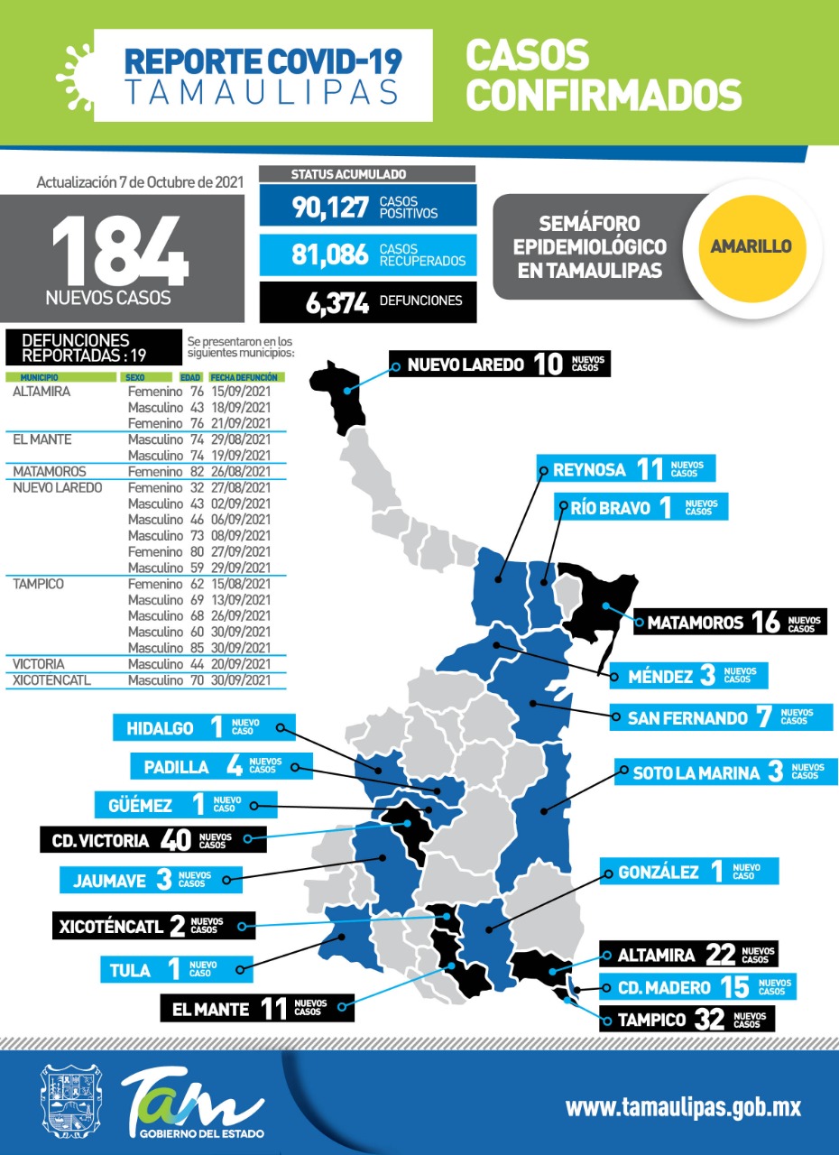 Tamaulipas cerró la jornada de este jueves con 184 nuevos pacientes positivos a COVID-19 y 19 fallecimientos, informó desde esta ciudad capital, la secretaria de Salud, Gloria Molina Gamboa al presentar su reporte diario.