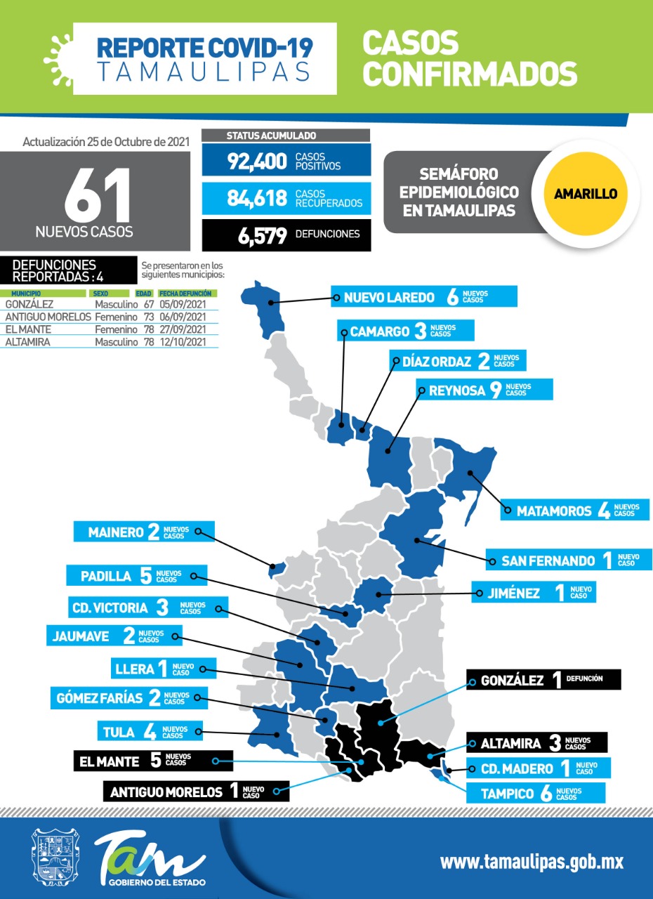 Tamaulipas cerró la jornada de este lunes, con 61 nuevos casos de COVID-19 y 4 defunciones, informó la secretaria de Salud, Gloria Molina Gamboa tras exhortar a la población a atender las medidas de prevención ya conocidas para continuar con el descenso gradual de contagios.