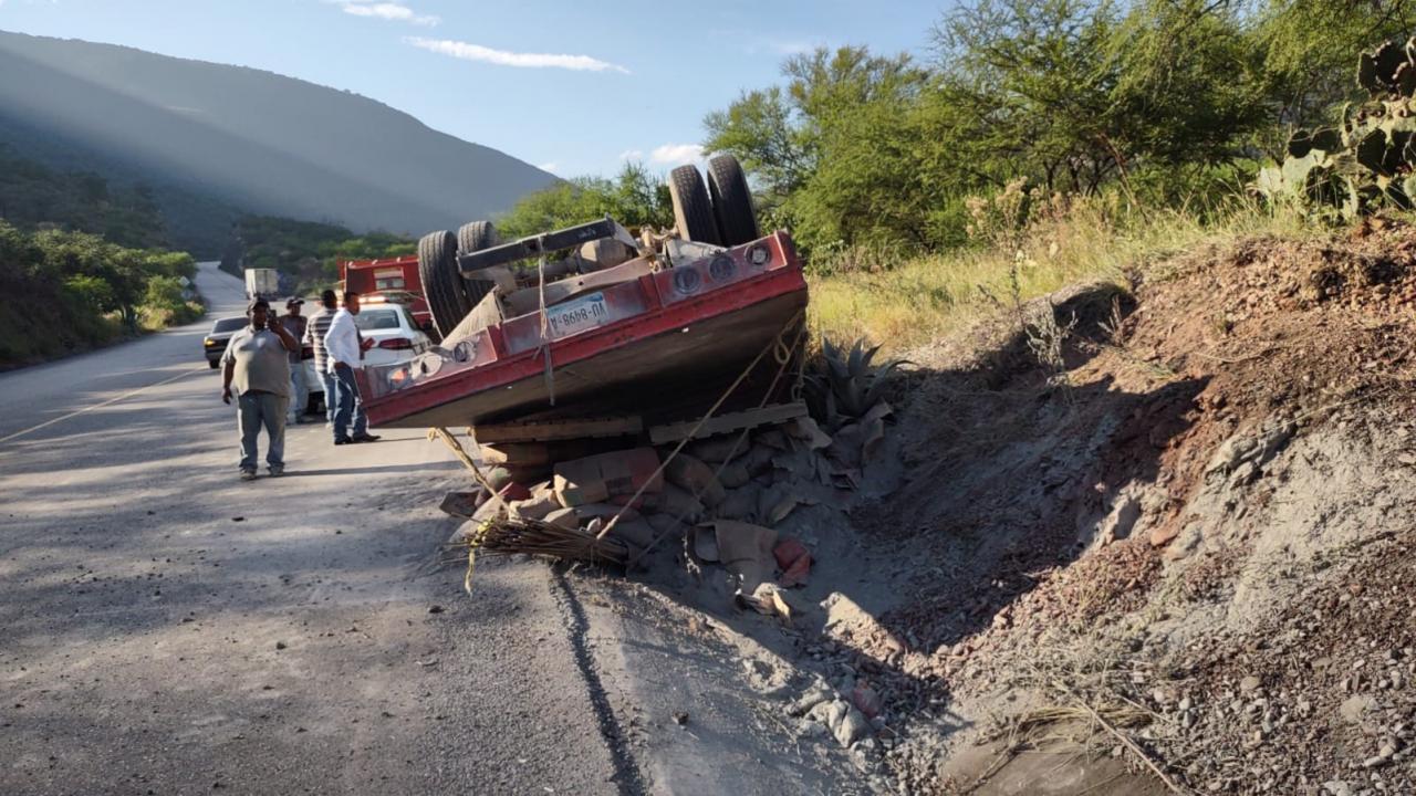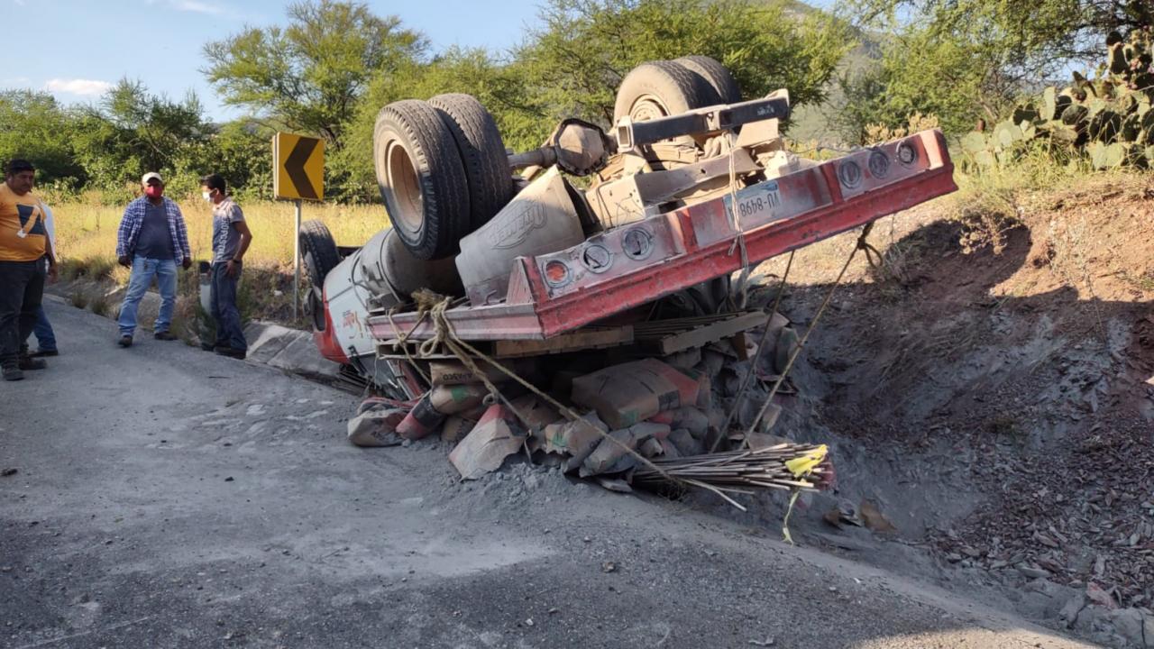 La volcadura del camión materialista ocurrió esta tarde a la altura del kilómetro 25 de la carretera Rumbo Nuevo.