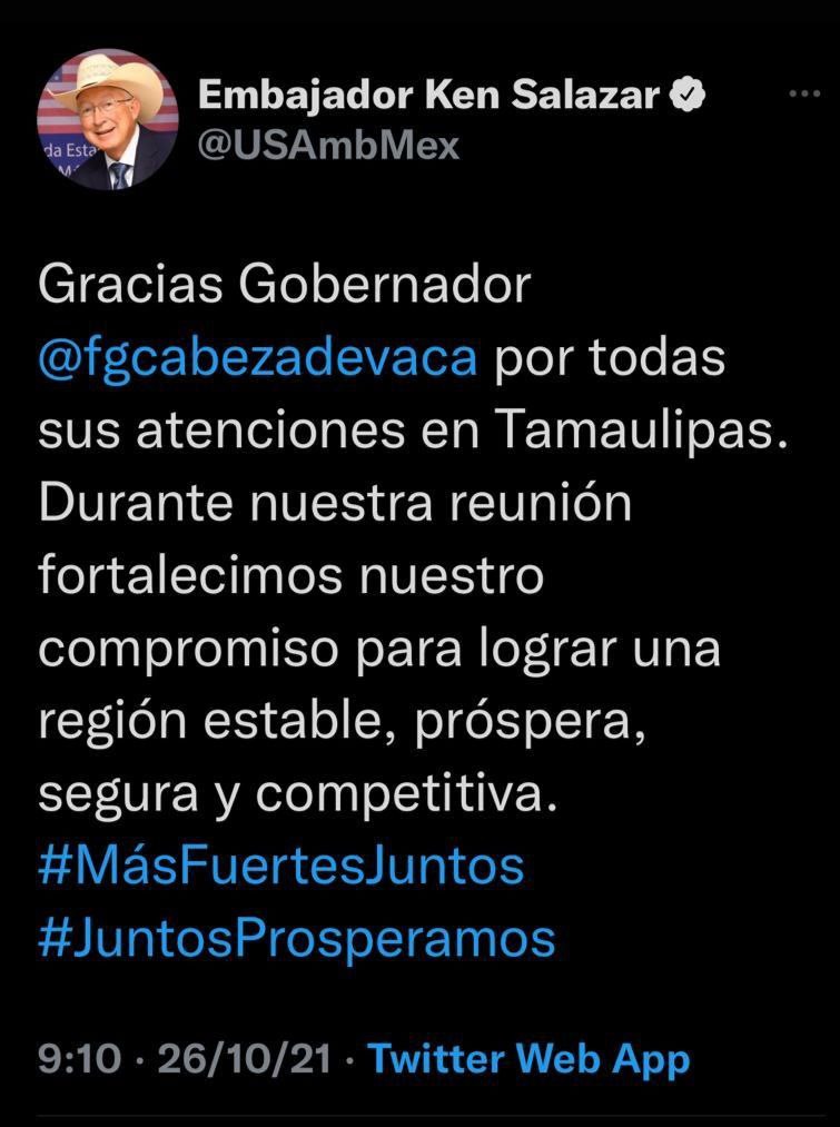“Gracias gobernador @fgcabezadevaca por todas sus atenciones en Tamaulipas. Durante nuestra reunión fortalecimos nuestro compromiso para lograr una región estable, próspera, segura y competitiva. #MasFuertesJuntos #JuntosProsperamos”, dice en su tweet el Embajador.
