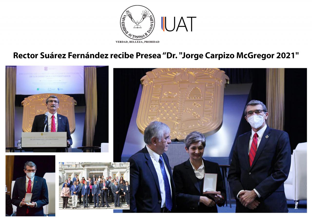 En virtud de su gestión humanista, su política de inclusión y el impulso a los derechos humanos desde el seno de la Universidad Autónoma de Tamaulipas (UAT), el Ing. José Andrés Suárez Fernández, Rector de la máxima casa de estudios, fue galardonado con la Presea “Dr. Jorge Carpizo McGregor” 2021 en el encuentro de la Red de Organismos Defensores de los Derechos Universitarios (REDDU).