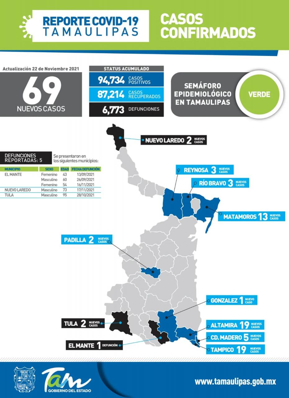 Ciudad Victoria, Tamaulipas.- Tamaulipas cerró la jornada de este lunes con 69 pacientes positivos a COVID-19 y 5 víctimas mortales por complicaciones graves, informó en su reporte diario la secretaria de Salud, Gloria Molina Gamboa.