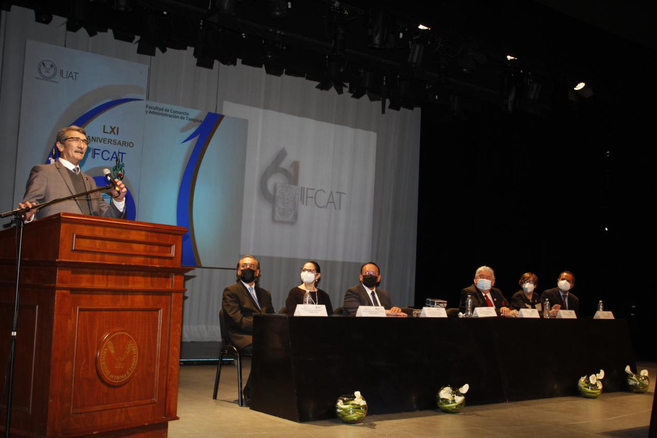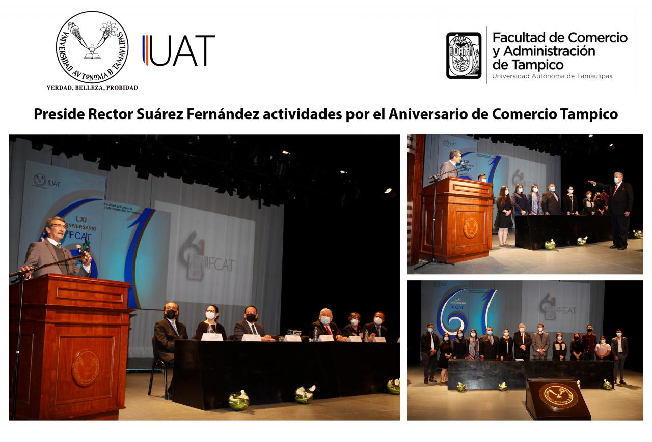 El Rector de la Universidad Autónoma de Tamaulipas (UAT), Ing. José Andrés Suárez Fernández, encabezó las actividades organizadas para celebrar el 61 Aniversario de la Facultad de Comercio y Administración de Tampico (FCAT), en cuyo marco recibió un homenaje en reconocimiento a su trayectoria académica y por su labor al frente de la máxima casa de estudios de la entidad.