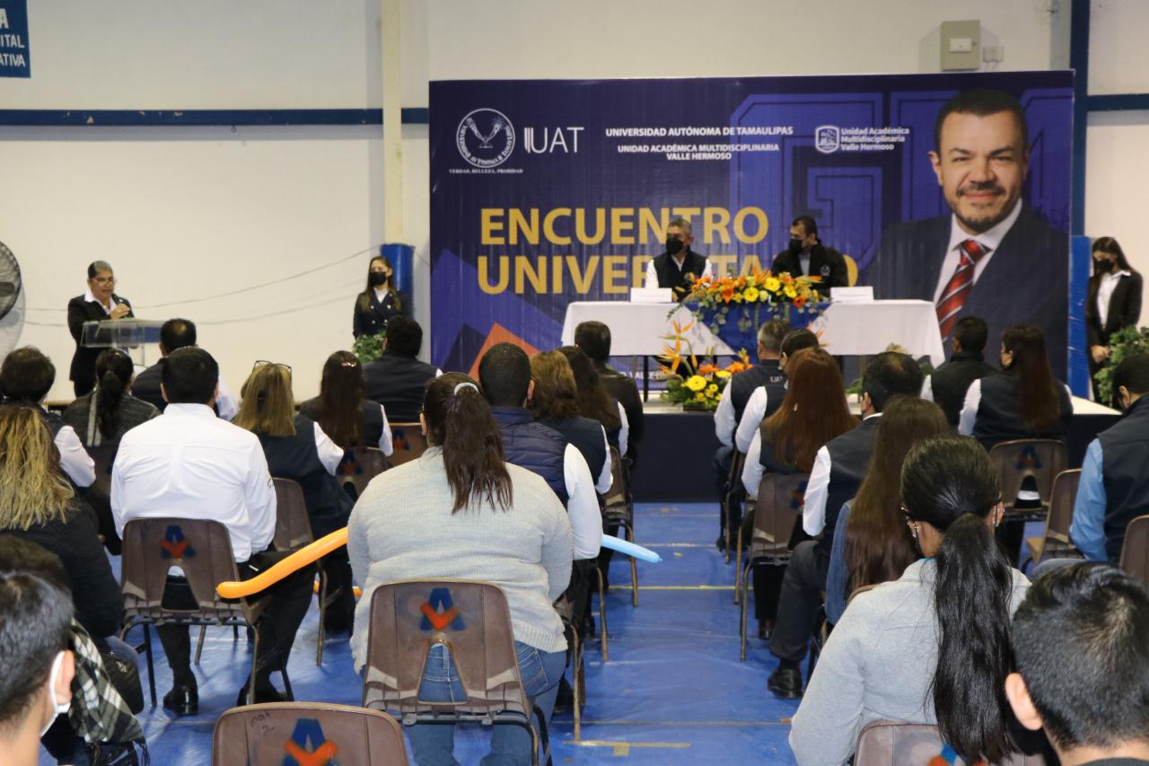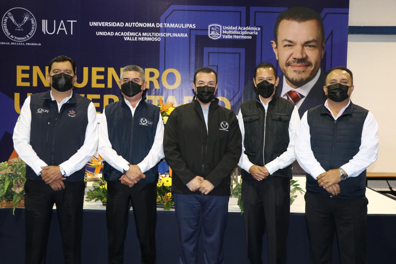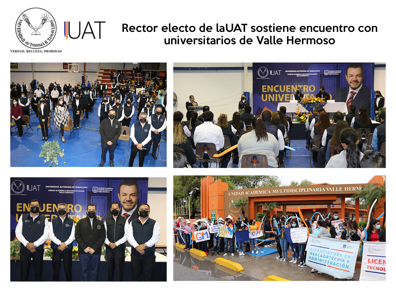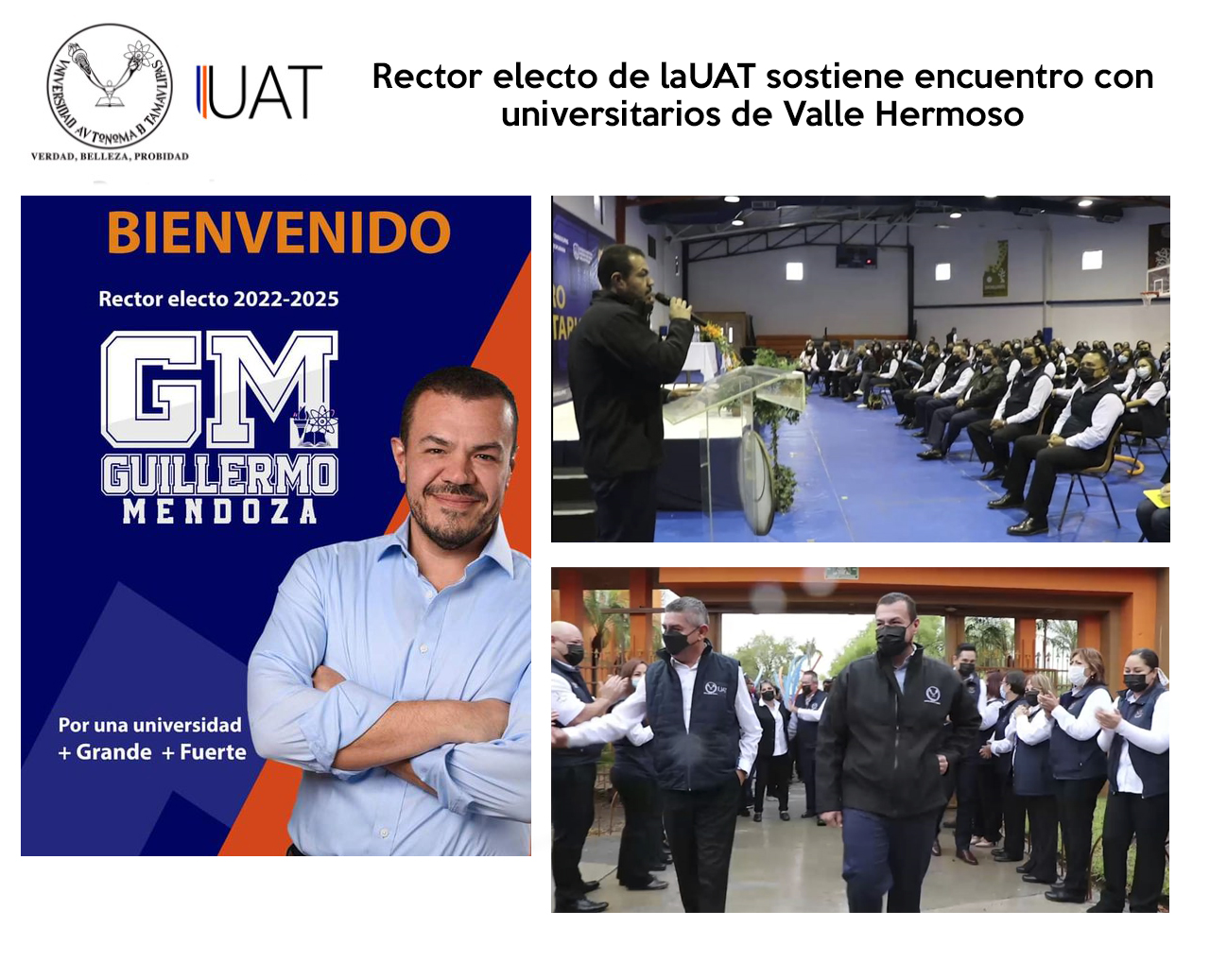 El Rector Electo de la Universidad Autónoma de Tamaulipas (UAT), C. P. Guillermo Mendoza Cavazos, visitó la Unidad Académica Multidisciplinaria Valle Hermoso (UAMVH), donde sostuvo un encuentro con personal docente y estudiantes, a quienes expresó el objetivo de trabajar juntos para seguir impulsando una Universidad más grande y más fuerte en beneficio de la juventud y la sociedad tamaulipeca.