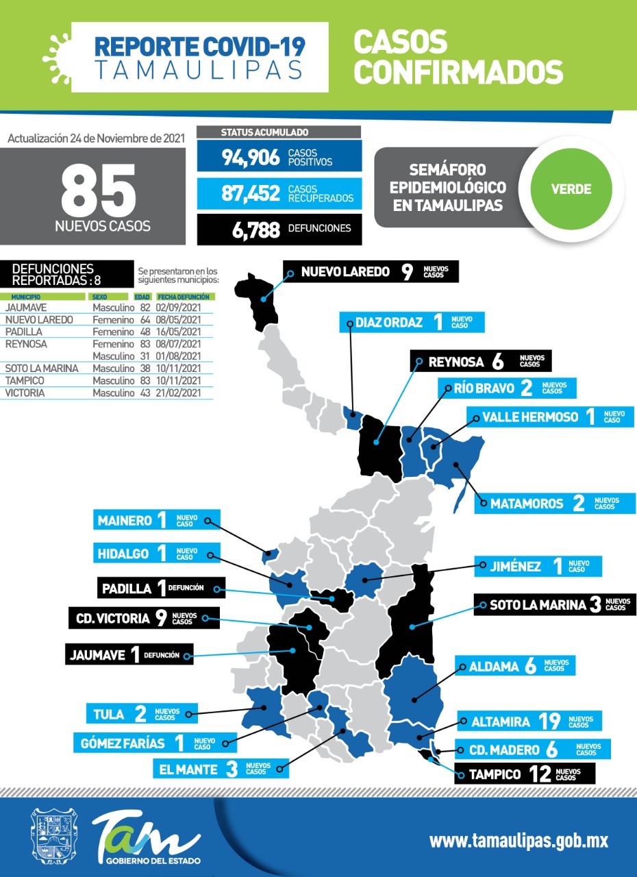 Ciudad Victoria, Tamaulipas.- Durante la jornada de este miércoles, Tamaulipas sumó 85 nuevos casos de COVID-19 a su conteo oficial, señaló la secretaria de Salud, Gloria Molina Gamboa luego de reiterar su llamado a evitar aglomeraciones, limitar el contacto con otras personas y seguir en todo momento las medidas de protección sanitaria.