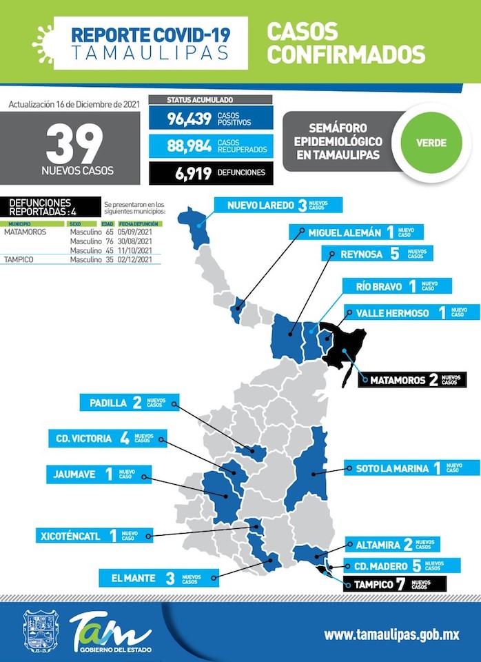 CIUDAD VICTORIA, TAMAULIPAS.- Tamaulipas cerró la jornada de este jueves con 39 pacientes positivos a COVID-19 y 4 fallecimientos asociados a complicaciones graves por el virus, informó la secretaria de Salud, Gloria Molina Gamboa al reiterar su llamado a ser ciudadanos socialmente responsables y aprender lo que más de 20 meses de pandemia han impactado en la población para evitar una cuarta ola de contagios.