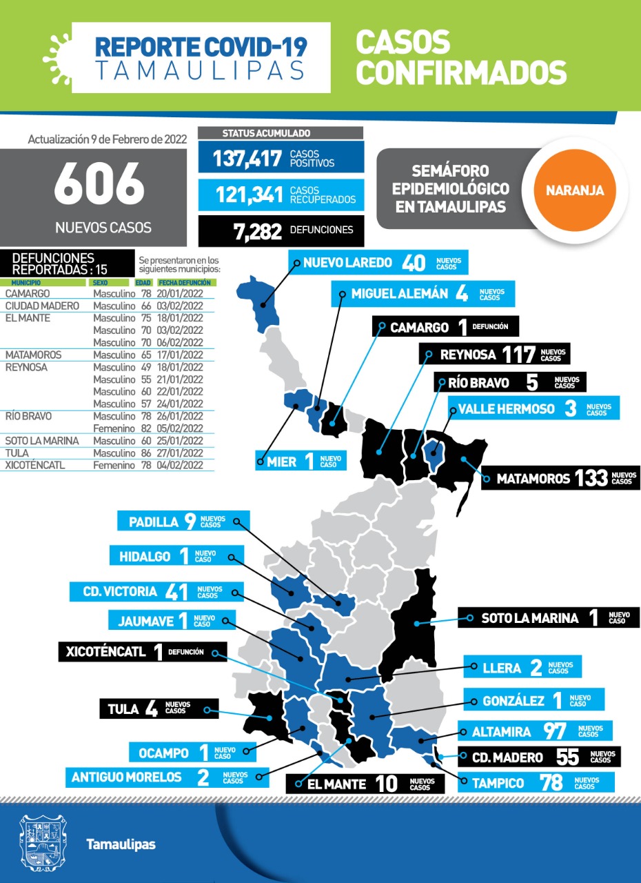 CIUDAD VICTORIA, TAMAULIPAS.- La Secretaría de Salud de Tamaulipas reportó 606 casos de COVID-19 al cerrar la jornada de este miércoles, reiterando el llamado a fortalecer la cultura de la prevención, evitar exponer a los más vulnerables y completar el esquema de vacunación contra la enfermedad.
