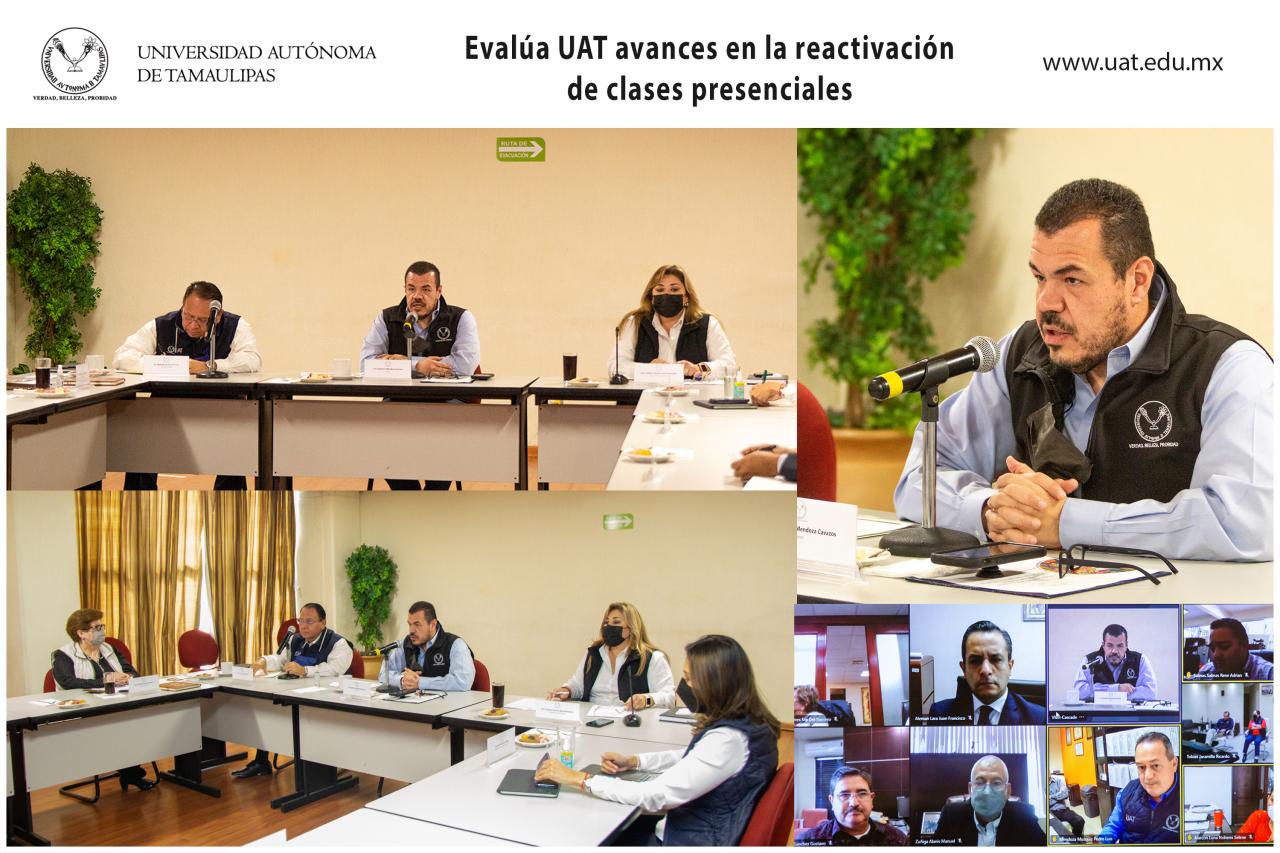 El C.P. Guillermo Mendoza Cavazos, Rector de la Universidad Autónoma de Tamaulipas (UAT), presidió la reunión de trabajo para evaluar los avances del regreso presencial a clases en las unidades académicas, facultades y escuelas de la máxima casa de estudios en la entidad.