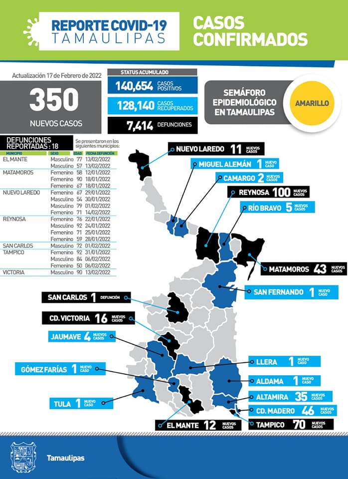 Tamaulipas cerró la jornada de este jueves con 350 nuevos casos de COVID-19 y 18 fallecimientos asociados a complicaciones graves por el virus, informó en su reporte diario la Secretaría de Salud estatal, luego de hacer un exhorto a la población a reforzar las medidas de seguridad sanitaria para continuar avanzando hacia la nueva normalidad.