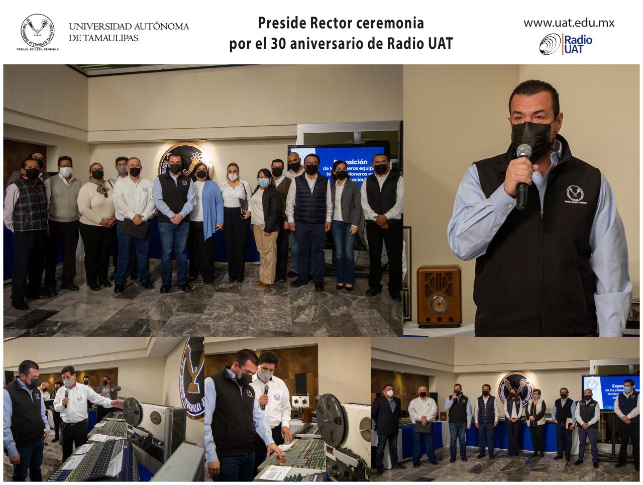 El C. P. Guillermo Mendoza Cavazos, Rector de la Universidad Autónoma de Tamaulipas, presidió el acto conmemorativo del trigésimo aniversario de la fundación de Radio UAT, ceremonia celebrada en el vestíbulo del edificio de la Rectoría, en esta capital.