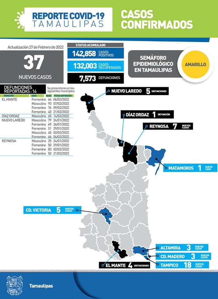 Tamaulipas cerró la jornada de este domingo con 37 casos de COVID-19 y 14 fallecimientos asociados a complicaciones graves informó la Secretaría de Salud, luego de convocar a la población a fortalecer las medidas de seguridad sanitaria para continuar con la tendencia descendente.