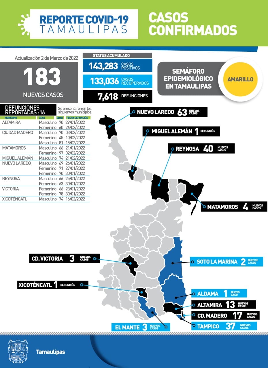 La pandemia de COVID-19 contabilizó 183 nuevos casos en Tamaulipas durante la jornada de este miércoles, informó en su reporte diario la Secretaría de Salud, luego de advertir que aun y cuando la cuarta ola ha registrado una disminución, el riesgo de contagio continúa, por lo que pidió no bajar la guardia.