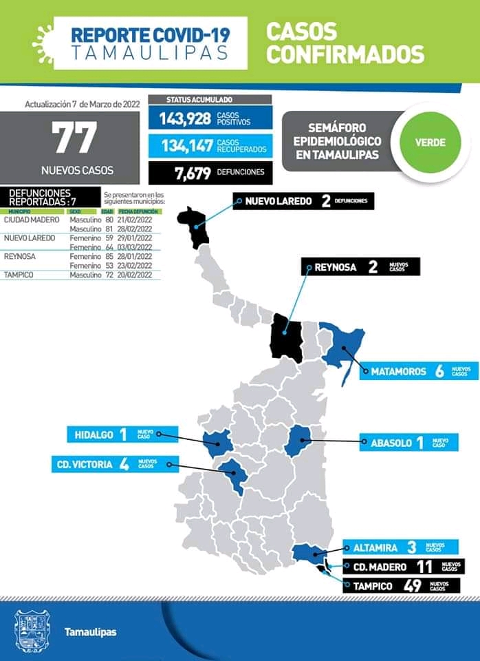 La Secretaría de Salud de Tamaulipas notificó 77 nuevos casos de COVID-19 y 7 fallecimientos durante la jornada de este lunes, por lo que reiteró el llamado a completar el esquema de vacunación para continuar con el descenso de casos y seguir avanzando a la nueva realidad.