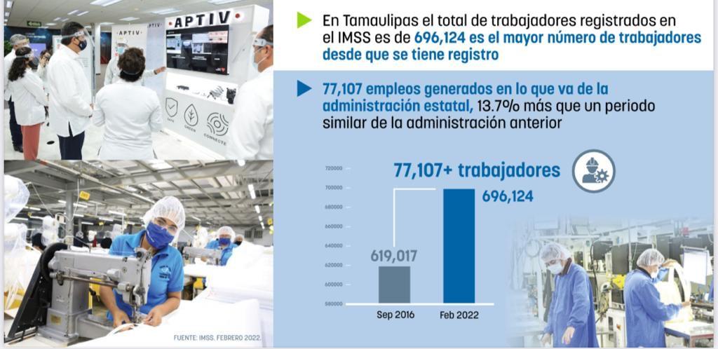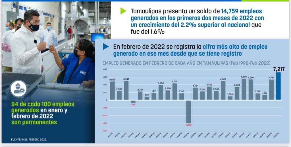 Durante el primer bimestre del 2022, Tamaulipas presentó un saldo positivo de 14,759 empleos; esto indica que se recuperaron todos los empleos perdidos al cierre del año 2021, como consecuencia de movimientos naturales en el sector industrial y comercial durante esa temporada.