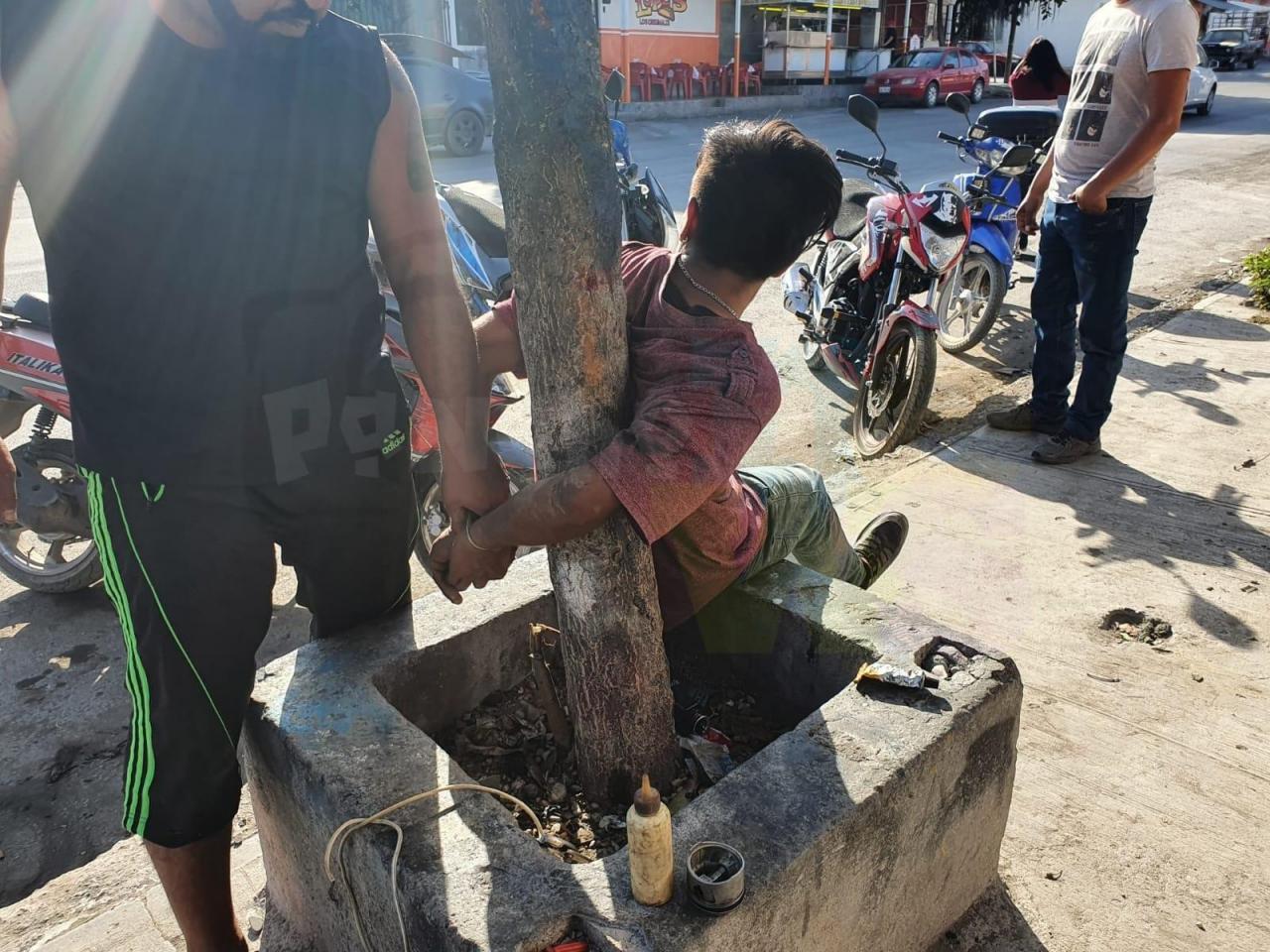 Tras reconocer la motocicleta, en cuestión de minutos lograron someter al menor para amarrarlo a un árbol.