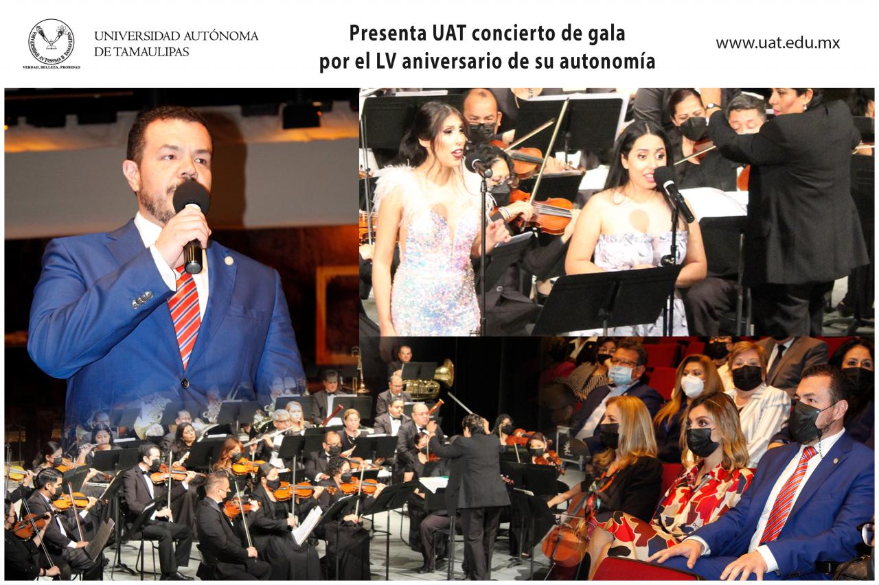 Con la presencia del Rector Guillermo Mendoza Cavazos, se desarrolló el concierto de gala que ofreció la Orquesta Sinfónica de la Universidad Autónoma de Tamaulipas (UAT) con motivo del LV Aniversario de la promulgación del decreto que dio autonomía a la máxima casa de estudios de la entidad.