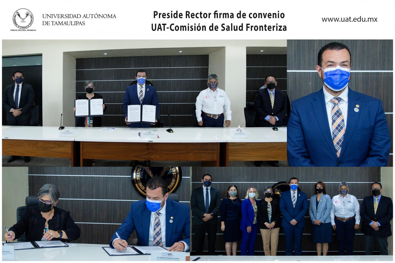 La Universidad Autónoma de Tamaulipas (UAT) y la Comisión de Salud Fronteriza México-Estados Unidos formalizaron mediante la firma del convenio marco de colaboración el acuerdo por contribuir en la formación humana y profesional, el intercambio académico y el desarrollo de proyectos científicos y tecnológicos.