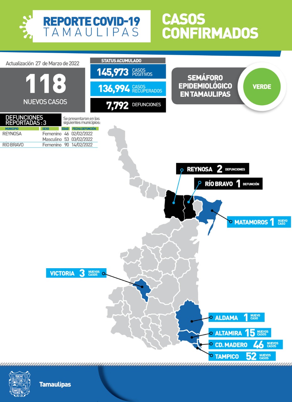 Ciudad Victoria, Tamaulipas.- Tamaulipas sumó este domingo 118 nuevos casos a su conteo oficial, informó en su reporte diario la Secretaría de Salud, luego de exhortar a la población a reforzar las medidas de seguridad sanitaria, ya que representan la forma más efectiva de cortar la cadena de transmisión del virus.