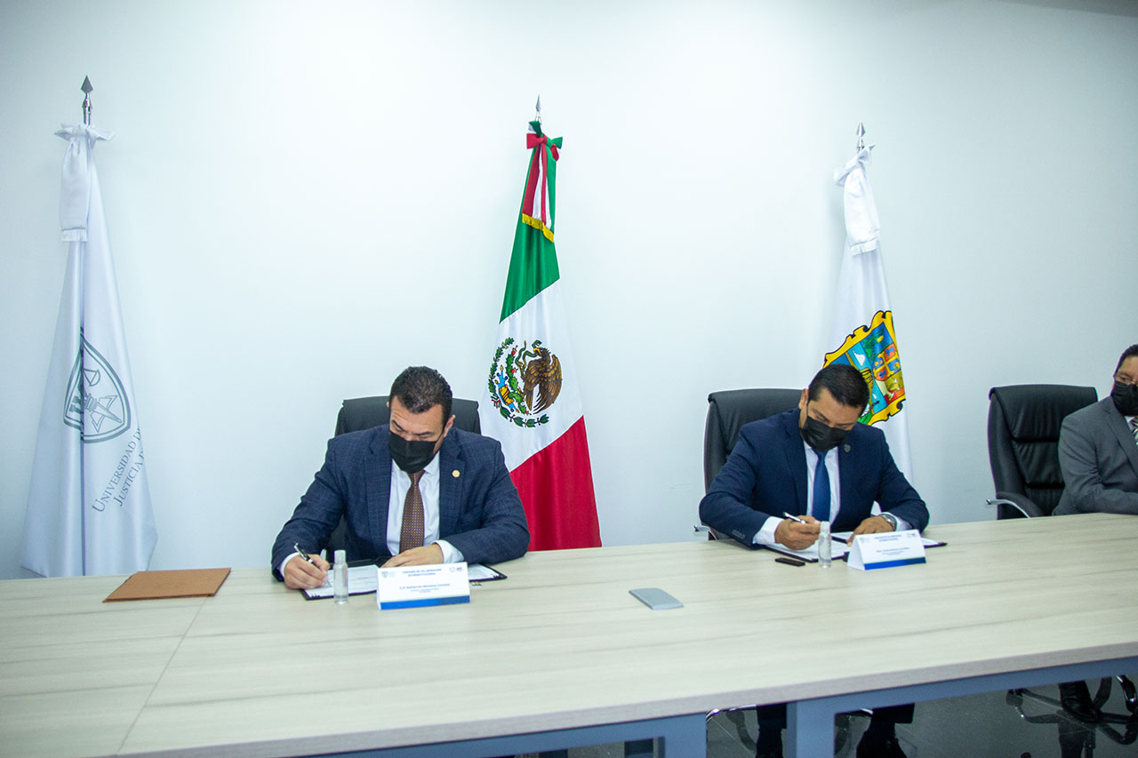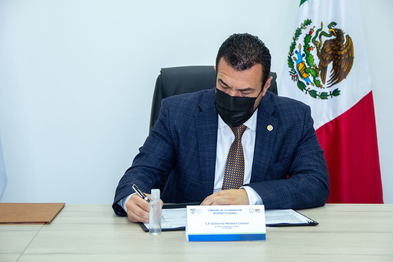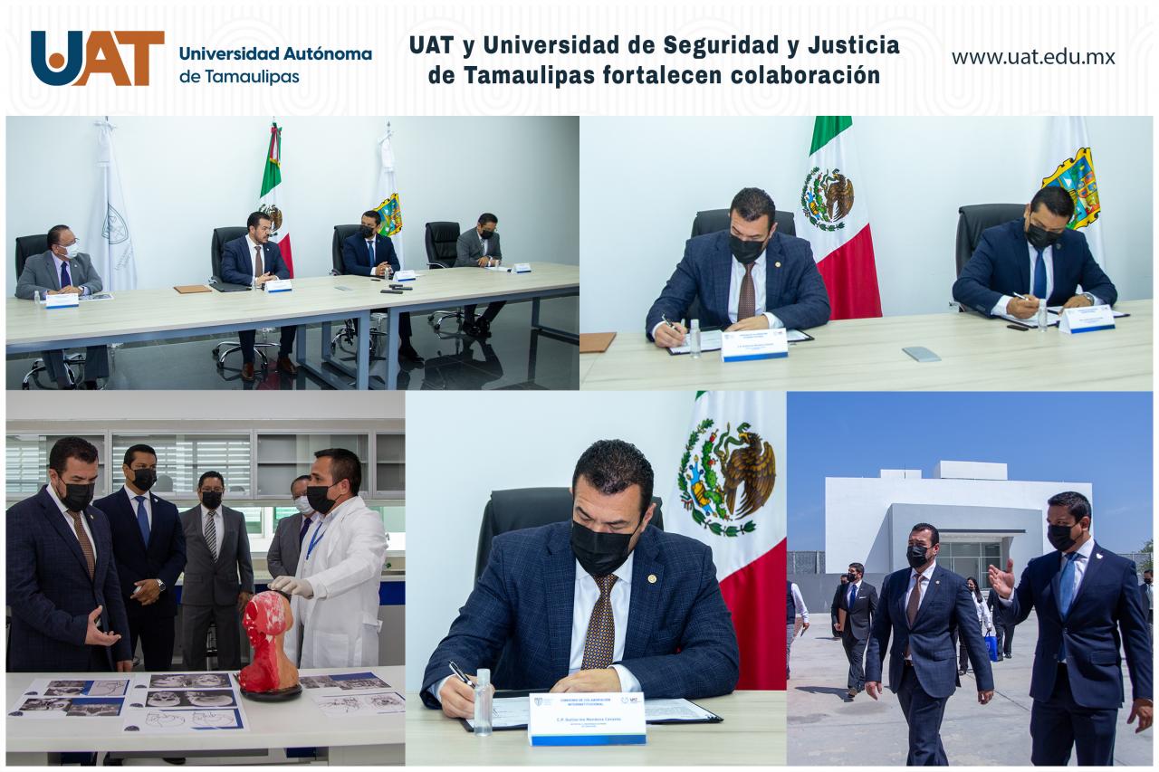 El C. P. Guillermo Mendoza Cavazos, Rector de la Universidad Autónoma de Tamaulipas (UAT), presidió con el Mtro. Jesús Antonio Lara Mata, Rector de la Universidad de Seguridad y Justicia de Tamaulipas (USJT), la firma de un convenio marco de colaboración que establece las bases generales de coordinación y cooperación para el desarrollo de programas conjuntos entre ambas instituciones de educación superior.